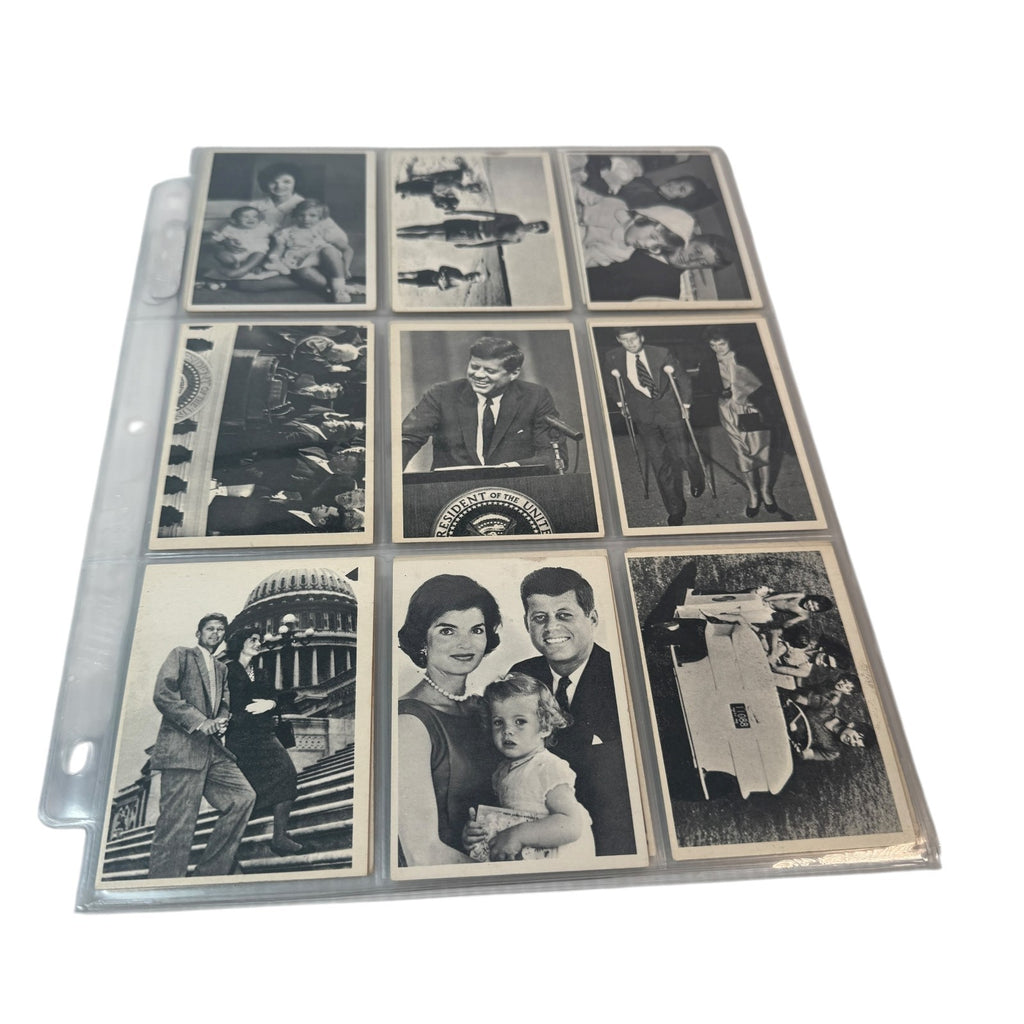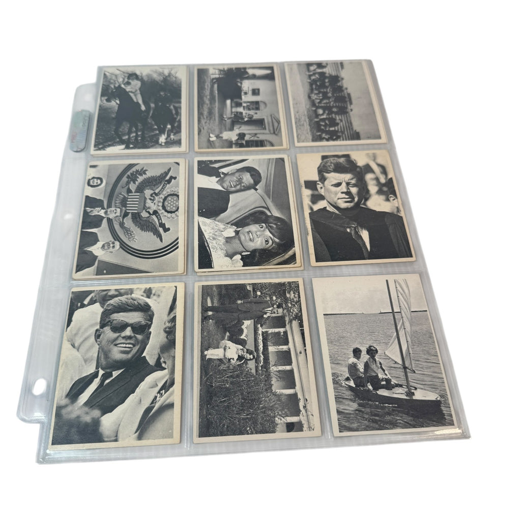 This is a complete set of 77 original Topps trading cards from the 1964 "The Story of John F. Kennedy" JFK collection. These standard-sized cards are made of card stock and feature images and information about John F. Kennedy and his presidency. The set includes cards that specifically focus on JFK and the political and historical significance of JFK's time in office. These vintage trading cards offer a unique glimpse into the United States during the 1960s and are a must-have for collectors of political memorabilia.