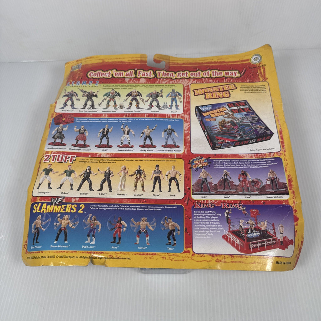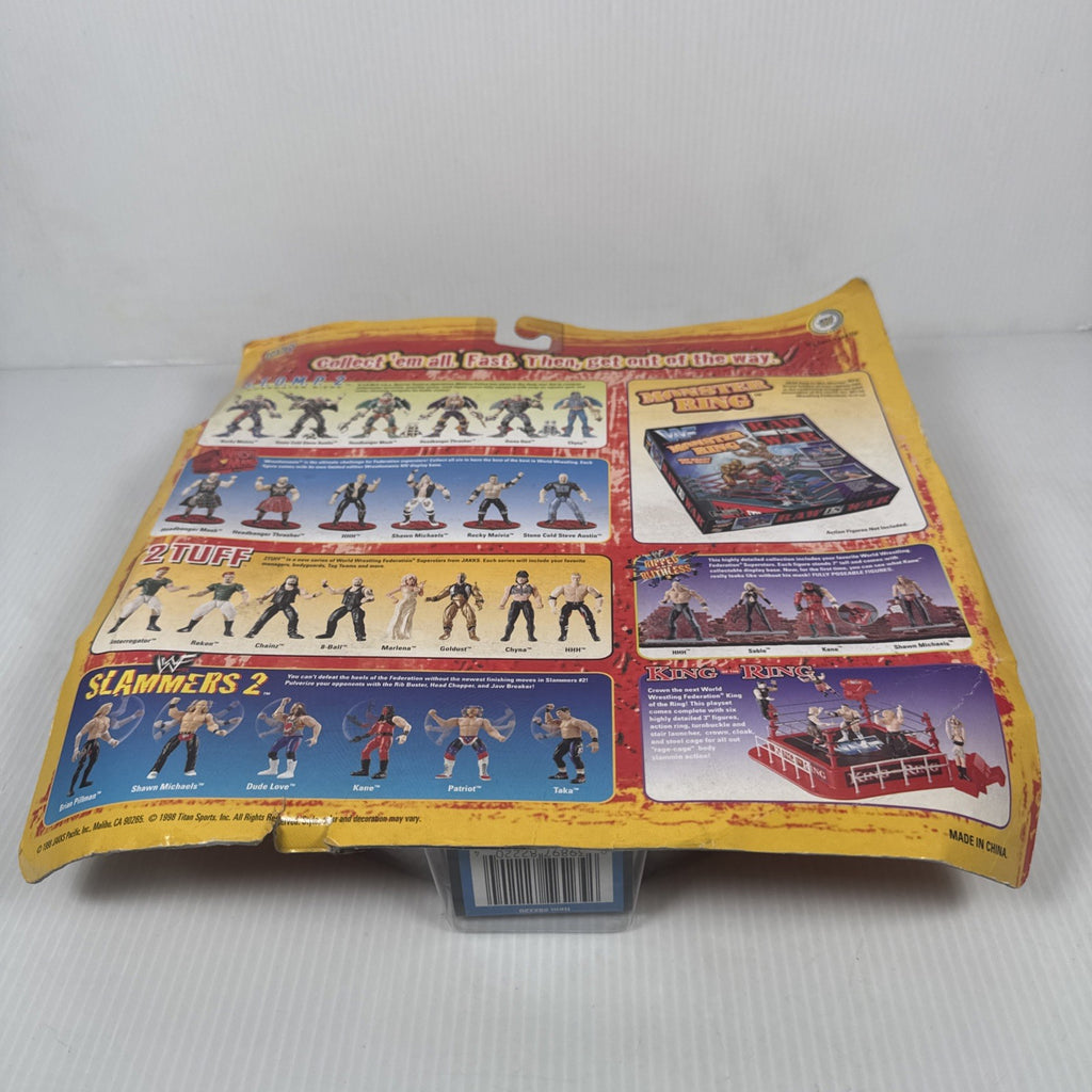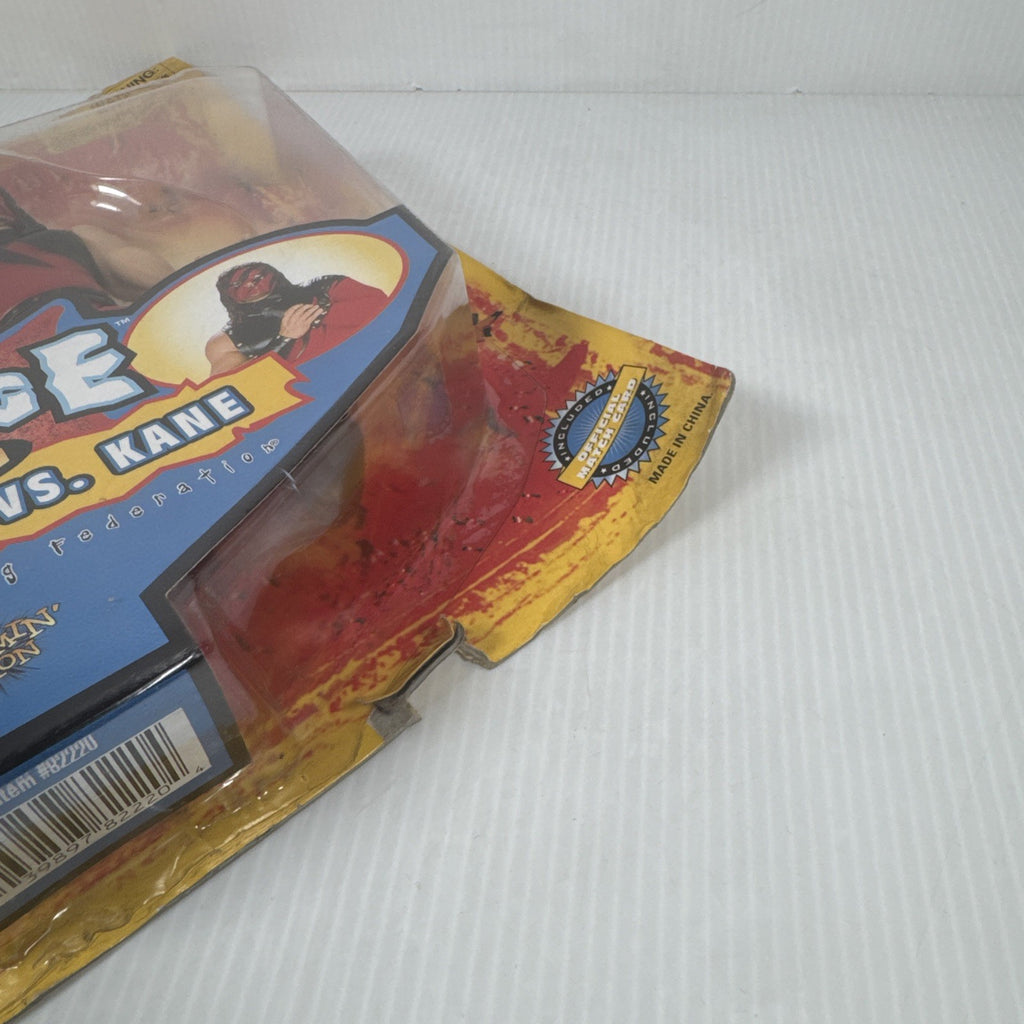 This wrestling figure is sealed in its original package. The cardback has wear from age and shelf wear including curing, corner wear, and wear to the bottom plastic. See photos for specific wear to the packaging.