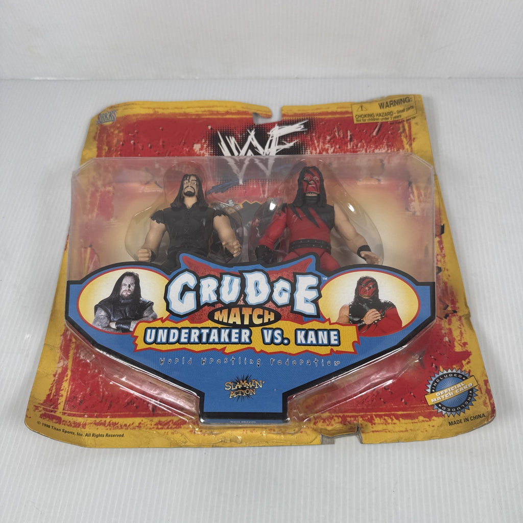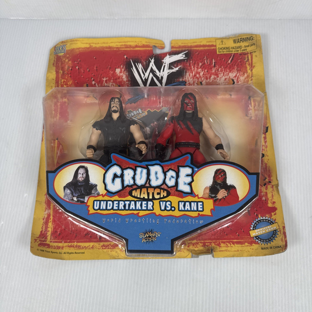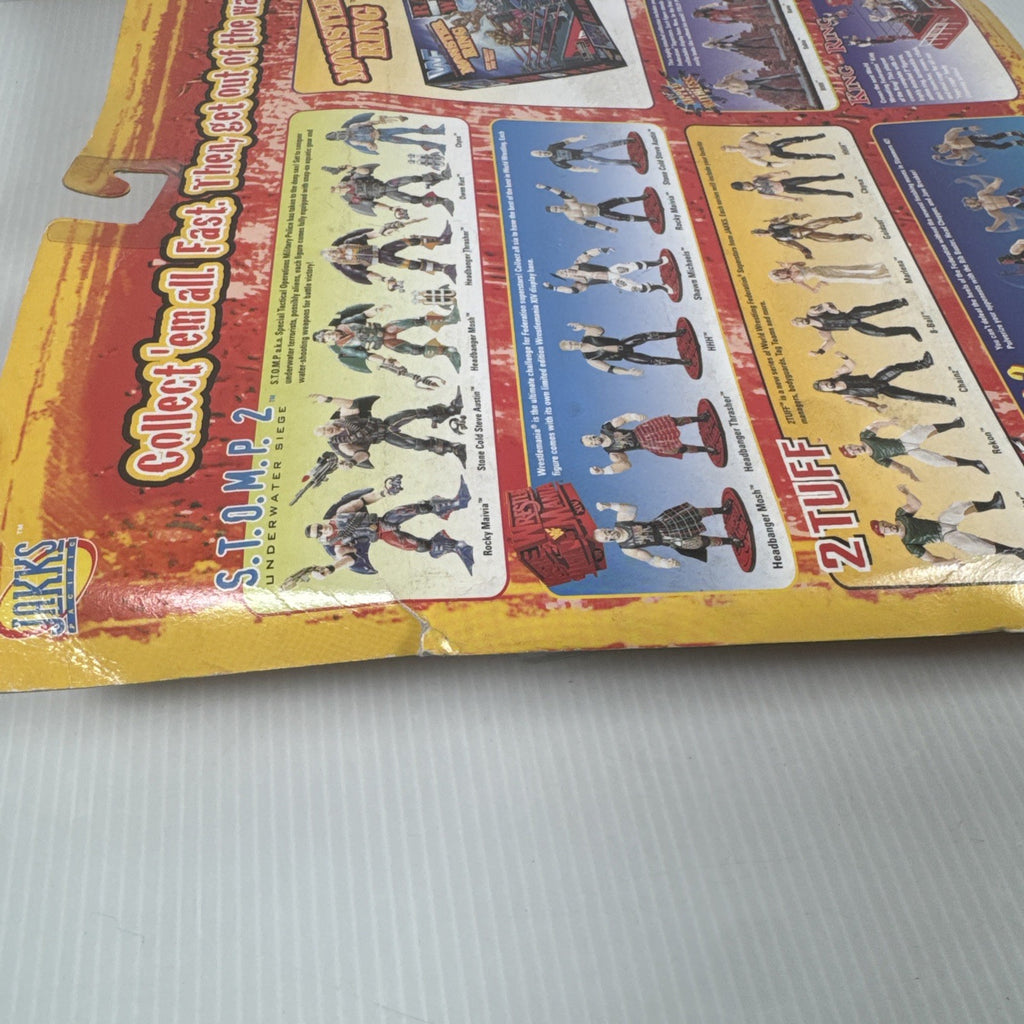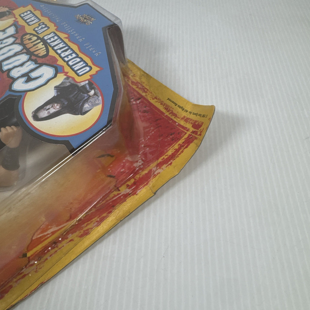 This wrestling figure is sealed in its original package. The cardback has wear from age and shelf wear including curing, corner wear, and wear to the bottom plastic. See photos for specific wear to the packaging.