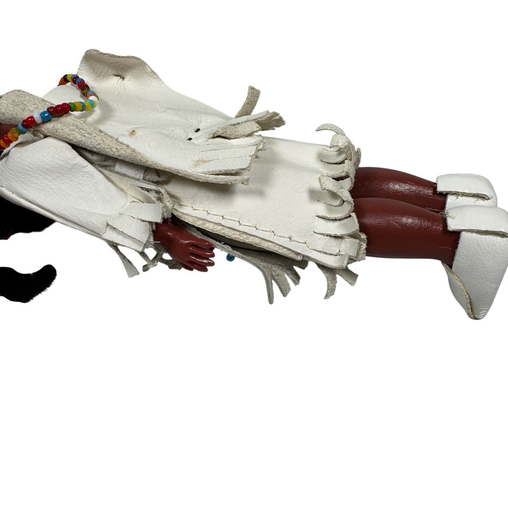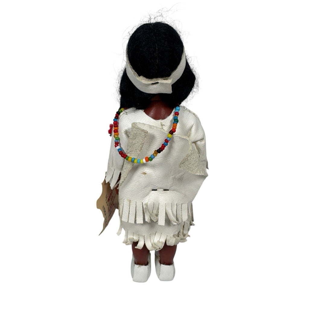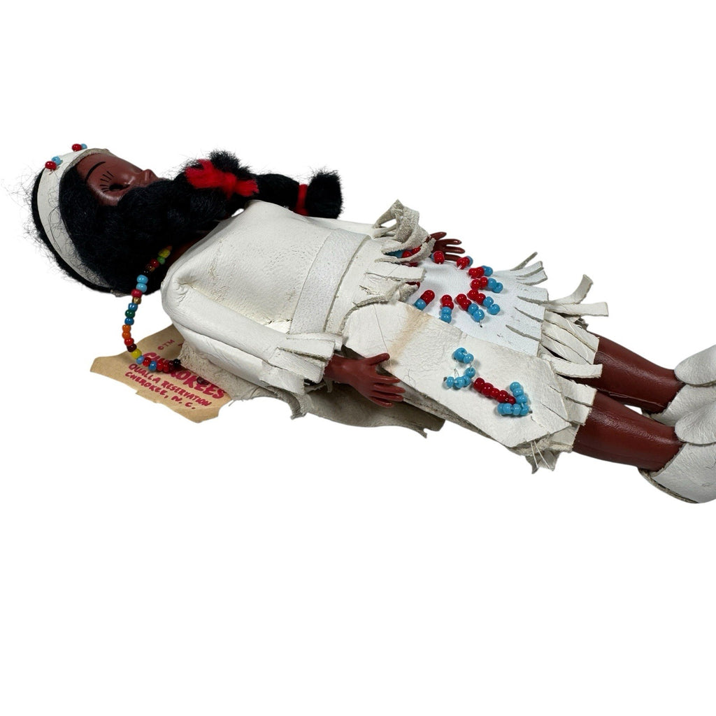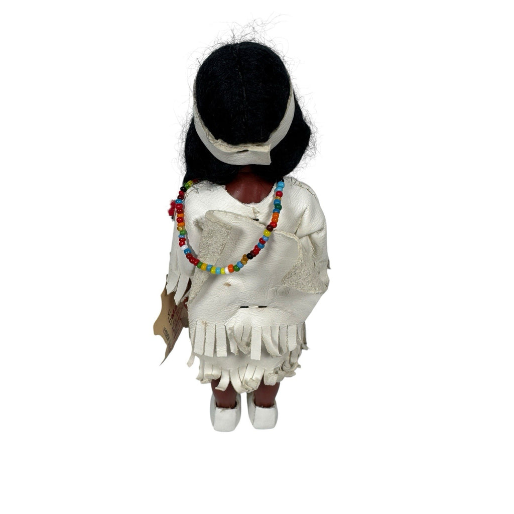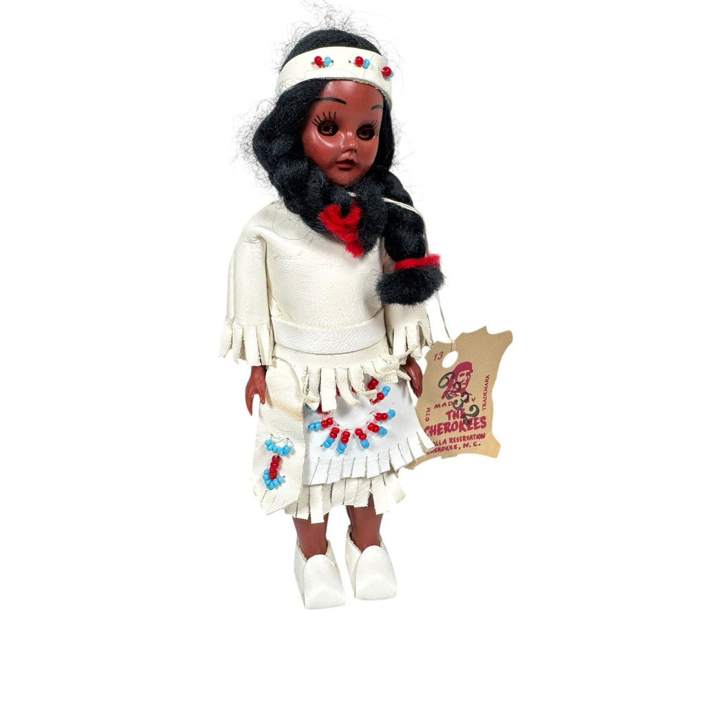 This 6" vintage doll, made by the Cherokees, features an original tag and is a single unit. The artist, The Cherokees, have crafted a unique doll with black hair that is straight. This interactive doll, with eyes that open and close, is made of leather and plastic materials.