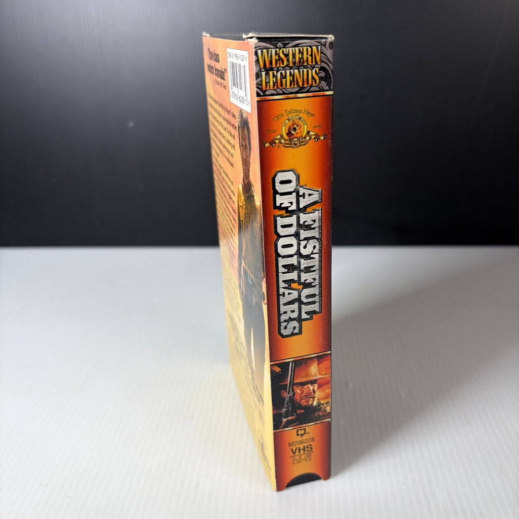 Experience the iconic Western film "A Fistful of Dollars," starring Clint Eastwood in his legendary role as the "Man With No Name." Directed by Sergio Leone, this 1964 classic Western is packed with thrilling shootouts, dynamic performances, and atmospheric cinematography that helped redefine the genre. This VHS edition is part of the Western Legends collection by Metro Goldwyn Mayer, featuring original artwork and branding.