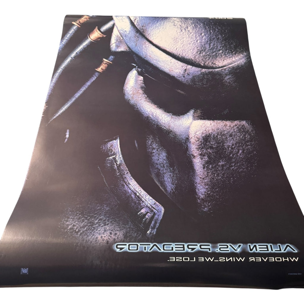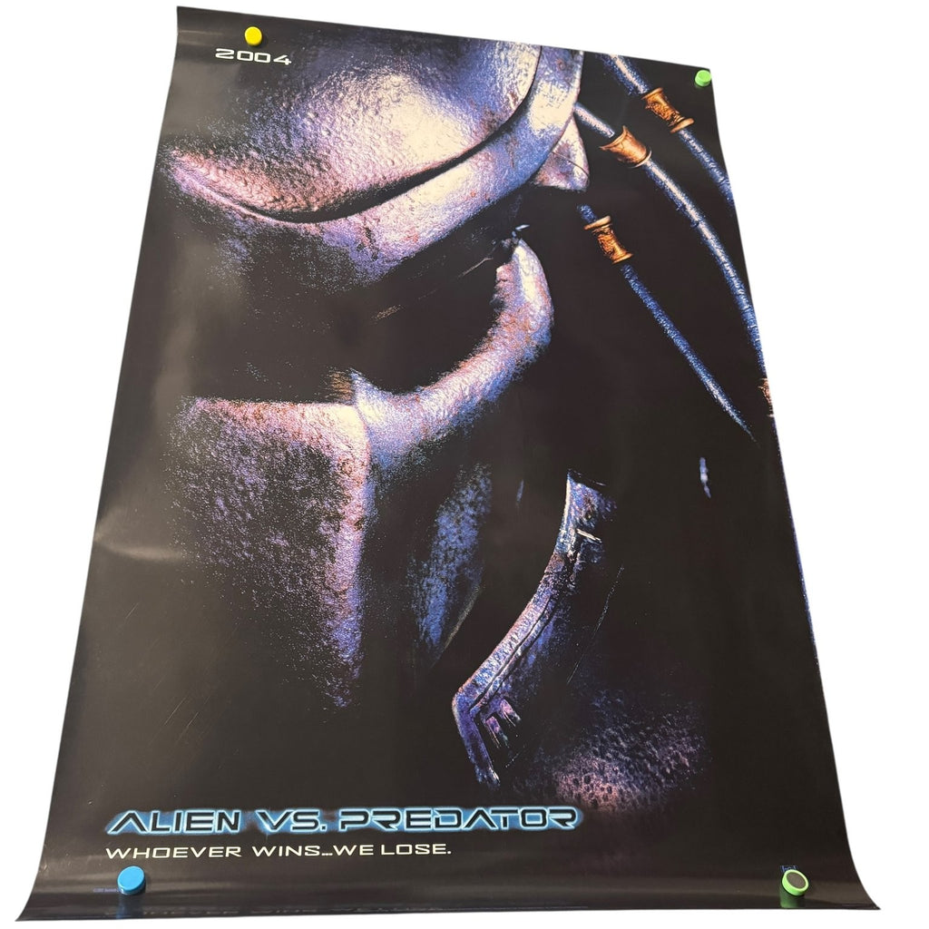 This is an original United States movie poster for the 2004 film Alien vs. Predator. The poster features a striking close-up image of the Predator's helmet in textured metallic hues of blue and purple against a black background. The tagline "Whoever Wins...We Lose." is prominently displayed below the movie title in glowing blue and white text. The stark, minimalist design draws attention to the iconic Predator character, making it a compelling collector's piece for fans of sci-fi and horror genres.