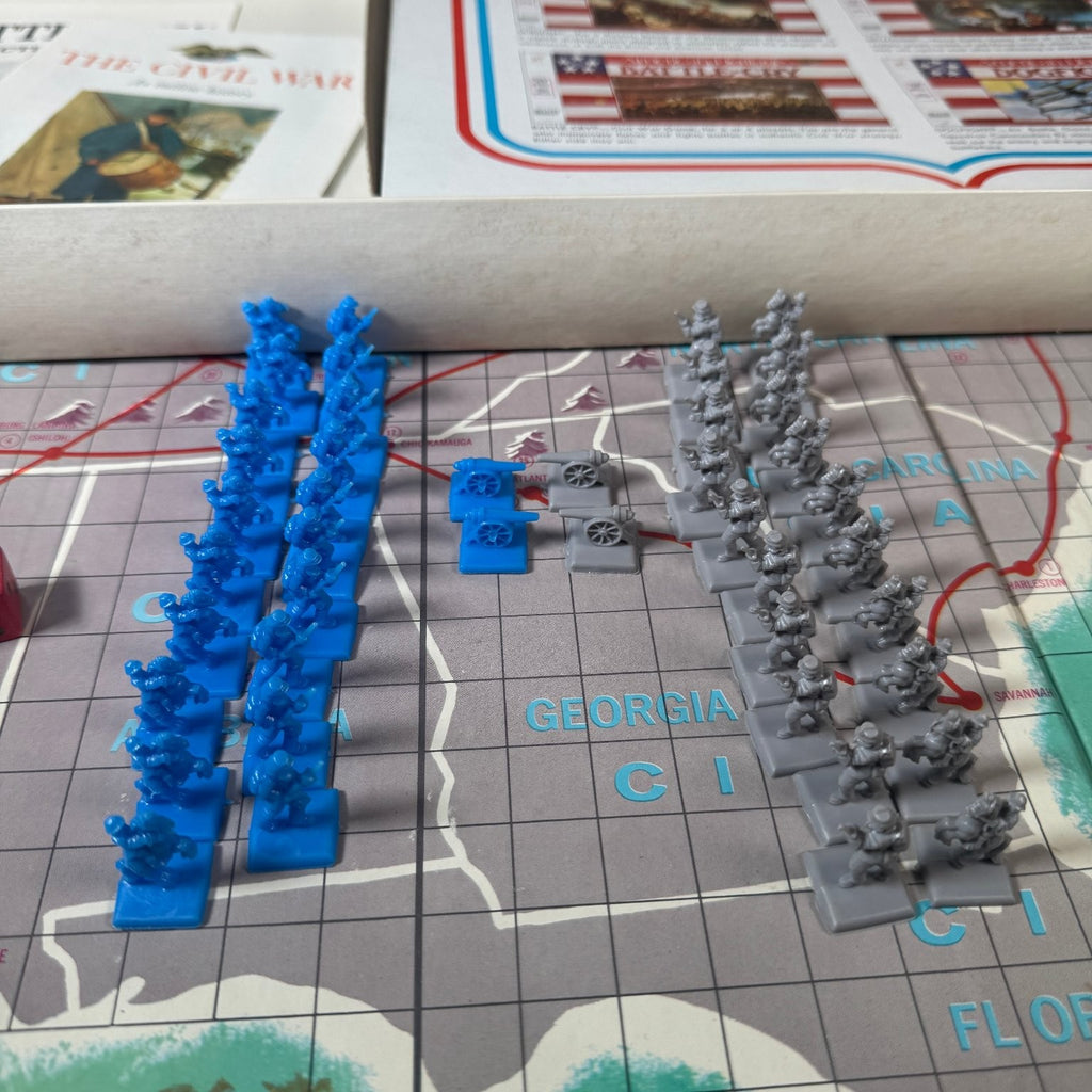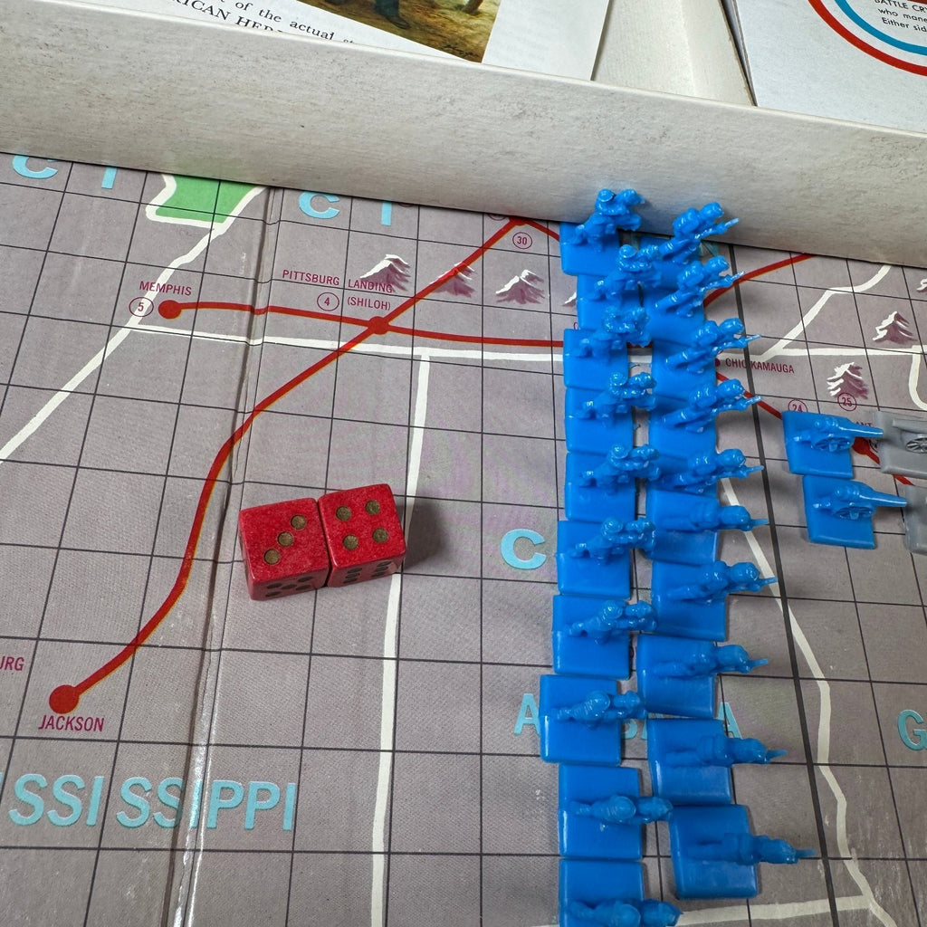 American Heritage Battle-Cry by Milton Bradley is a classic vintage board game that immerses players in the strategic maneuvers of the American Civil War. Designed for 2 to 4 players aged 10 and up, this command decision strategy game invites players to take on the role of generals, commanding troops and artillery across a detailed map of the southern United States. The game features a large fold-out board with a grid layout marking key states and battle locations, including Arkansas, Mississippi, Georgia, and the Carolinas.