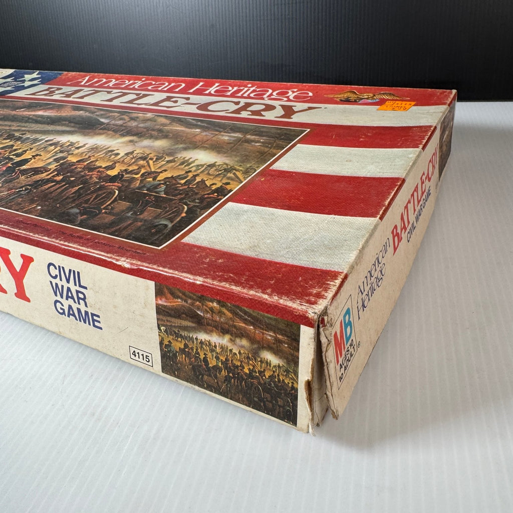 This edition includes intricately molded plastic miniatures representing infantry and artillery units in blue and gray, reflecting Union and Confederate forces. The components also include two red dice and detailed instruction manuals and a Civil War history booklet, offering context and depth for players interested in the historical background. The game's cover art depicts the Battle of Lookout Mountain, adding to its collectible appeal. Part of the American Heritage series by Milton Bradley, Battle-Cry offers engaging gameplay that combines history, tactics, and strategy, making it an excellent addition for collectors and fans of historical board games.This product is in Used condition.