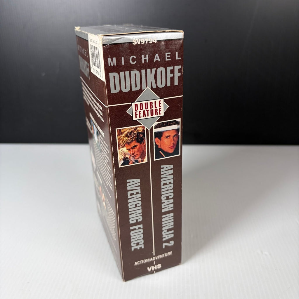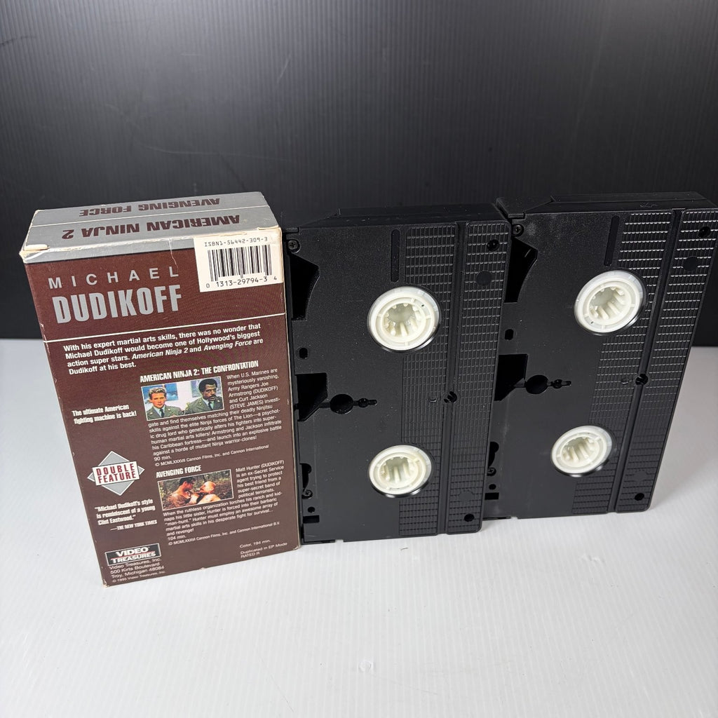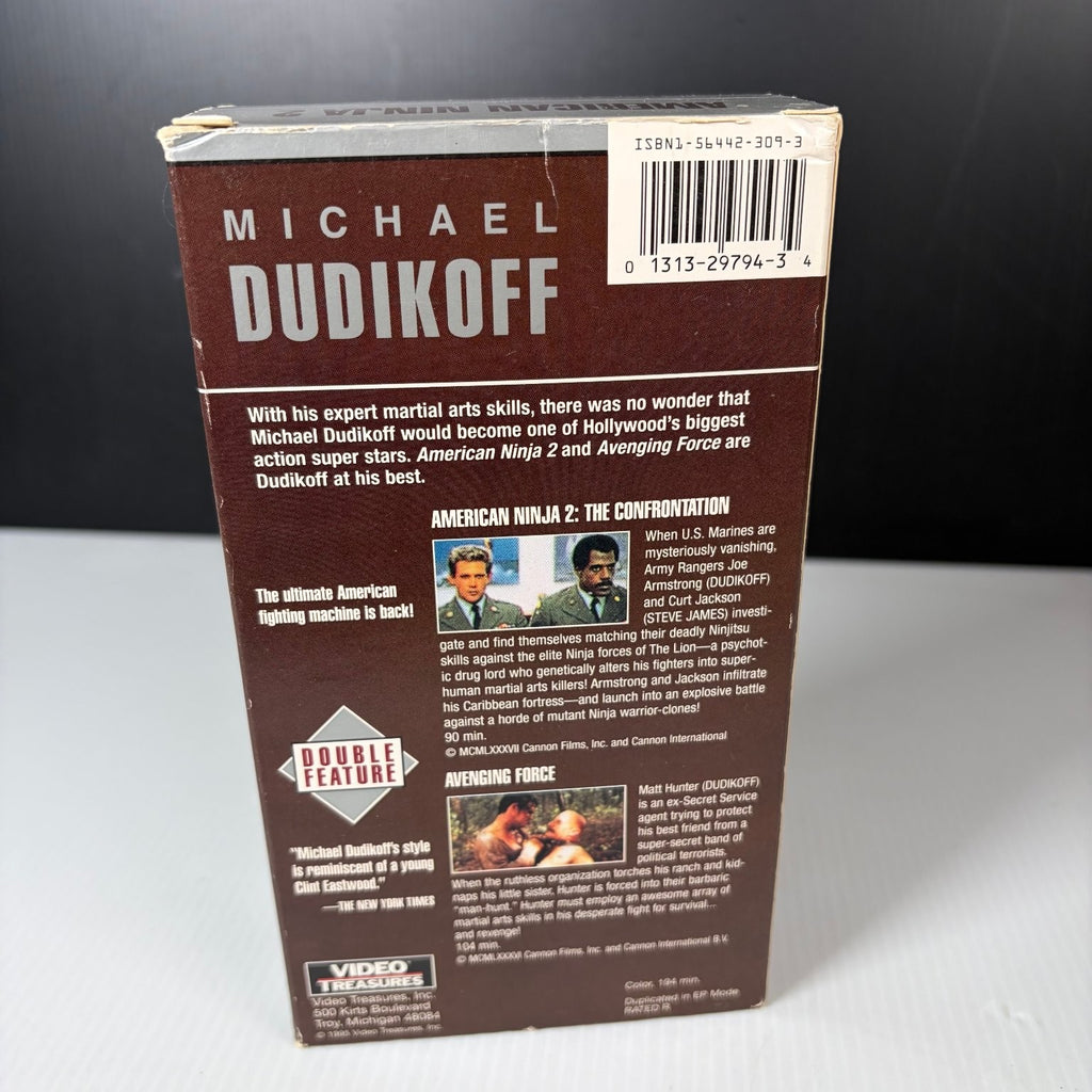 This double feature VHS tape set stars Michael Dudikoff in two classic action films: American Ninja 2: The Confrontation and Avenging Force. American Ninja 2 follows Joe Armstrong and Curt Jackson as they face off against a psychotic drug lord who genetically alters fighters into deadly ninjas. Avenging Force features Matt Hunter, an ex-Secret Service agent battling a ruthless terrorist group to protect his best friend and family. Both films showcase Dudikoff's expert martial arts skills and thrilling action sequences.