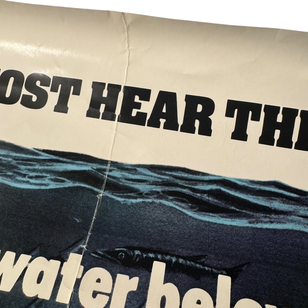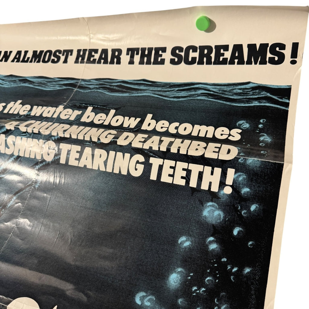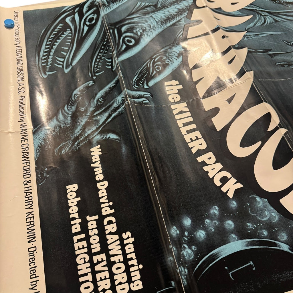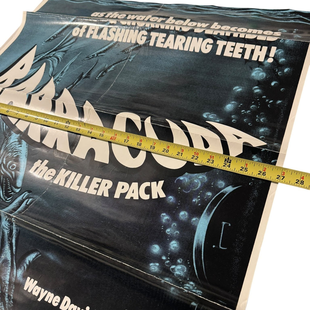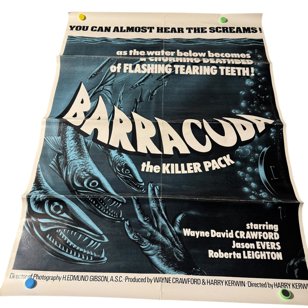 This is an original United States movie poster for the film "Barracuda" released in 1978. The poster features striking underwater artwork depicting menacing barracuda fish with flashing tearing teeth, lunging towards a terrified human hand. The tagline at the top reads, "You can almost hear the screams!" The poster credits key talent including stars Wayne David Crawford, Jason Evers, and Roberta Leighton. Directed by Harry Kerwin and produced by Wayne Crawford & Harry Kerwin, with cinematography by H. Edmund Gibson, A.S.C. The poster's artwork is a bold and chilling representation of the killer fish theme central to the film's horror plot. The poster format appears to be a standard One-Sheet, printed on paper, measuring approximately 27 by 41 inches as visually confirmed by the ruler shown. No artist or printer information is visible. There is no visible National Screen Service (NSS) number or litho claims on this piece. This vintage horror movie poster captures the thrilling and suspenseful mood of the late 1970s creature feature genre, appealing to collectors and fans of classic American horror cinema.This product is in Used condition.