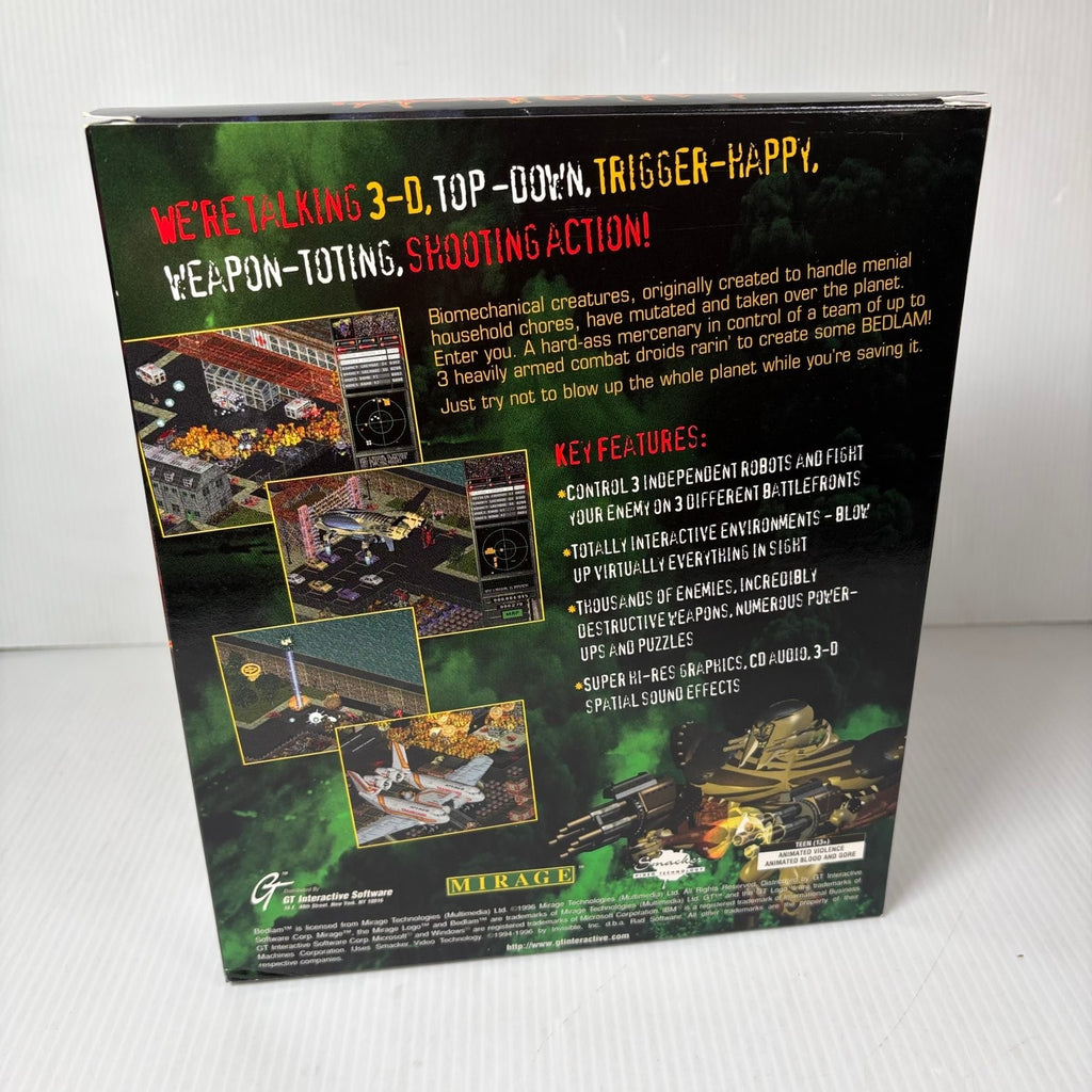 Immerse yourself in the explosive world of BEDLAM, a classic PC DOS and Windows 95 video game that delivers intense 3-D, top-down, trigger-happy, weapon-toting shooting action. As a mercenary, you're tasked with controlling three independent robots, each equipped to combat mutated biomechanical creatures and heavily armed combat droids across three distinct battlefronts. Prepare for an epic struggle to prevent total planetary annihilation, where strategic control of your units and overwhelming firepower are key to survival.