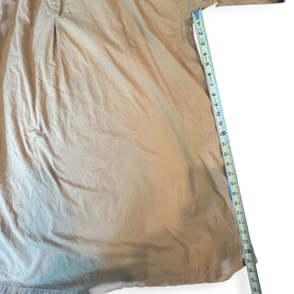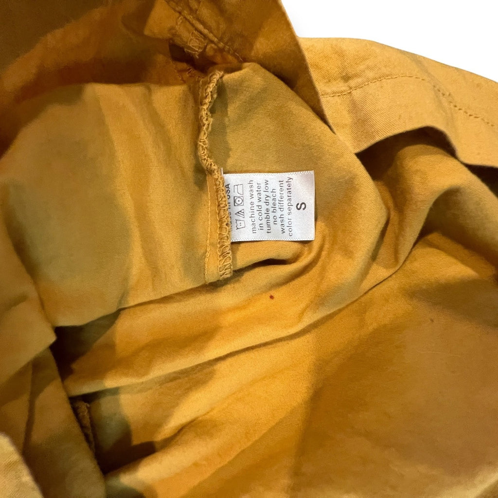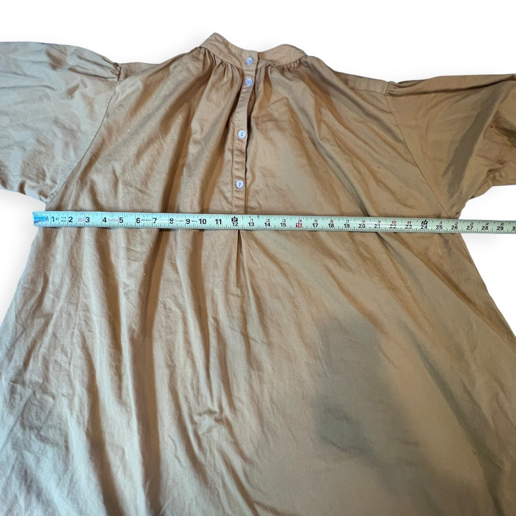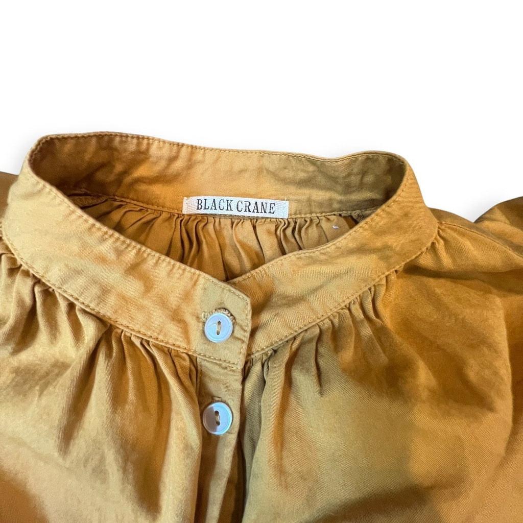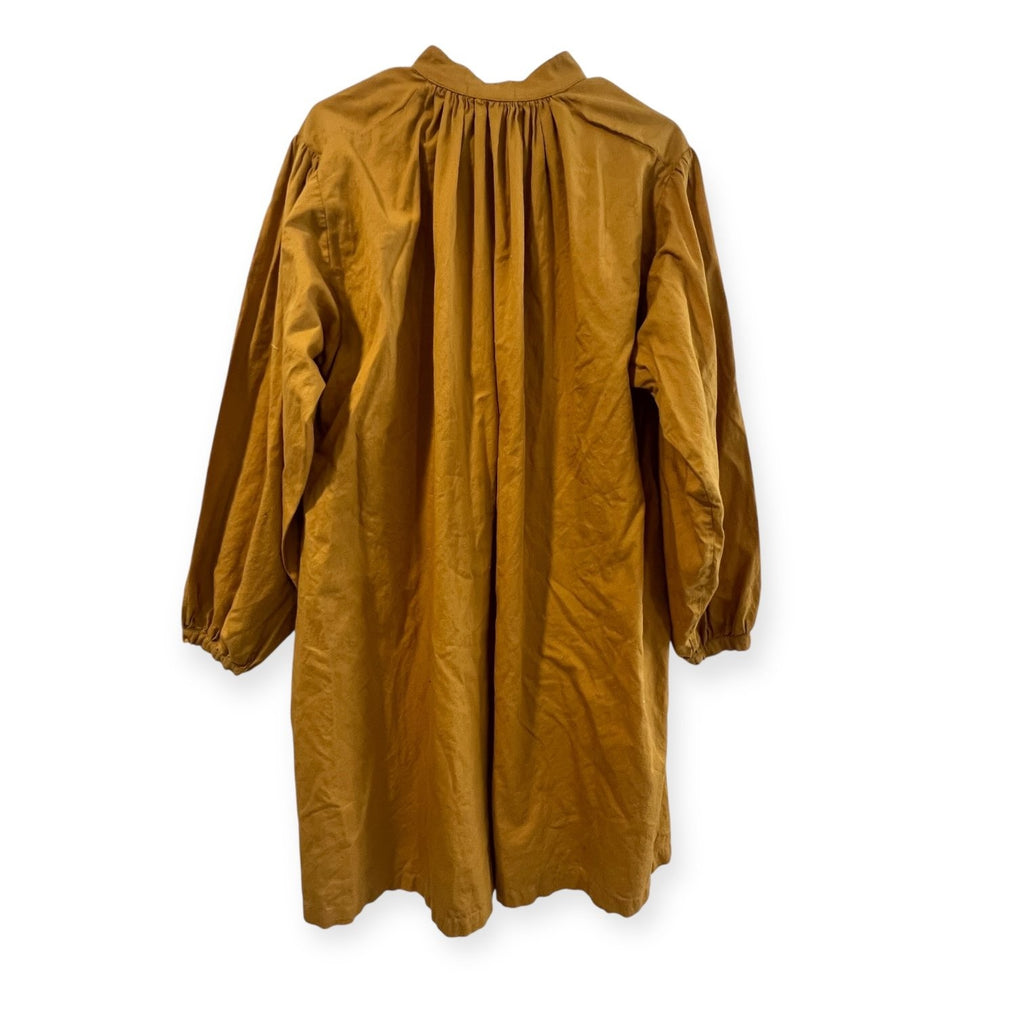 This Black Crane women's dress in a tulip honey yellow tone offers a relaxed, effortlessly chic style perfect for casual or transitional seasons. Crafted from breathable cotton fabric, the dress features a loose, flowing silhouette with long sleeves gathered at elastic cuffs, enhancing its vintage-inspired charm. The button-front placket extends partially down the front and back neckline, adding subtle design interest and easy wearability.