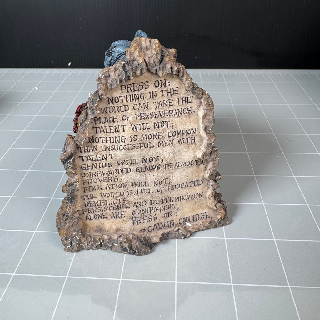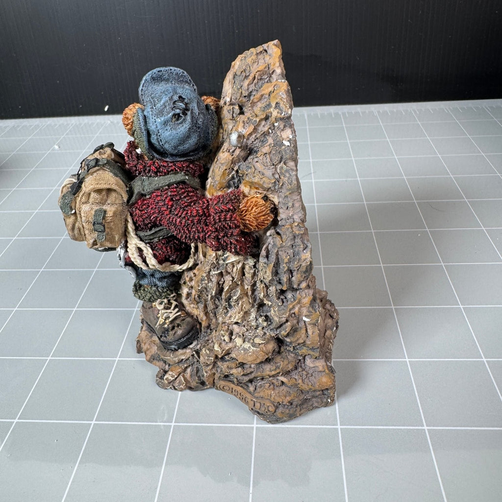 This is a collectible Boyds Bears & Friends vinyl figure from The Bearstone Collection, featuring an adorable bear climber character. The figure depicts a bear wearing a blue cap, red sweater, blue shorts, and hiking boots with a large tan backpack, shown climbing a rocky base. The rear of the base is inscribed with an inspirational Calvin Coolidge quote about perseverance.