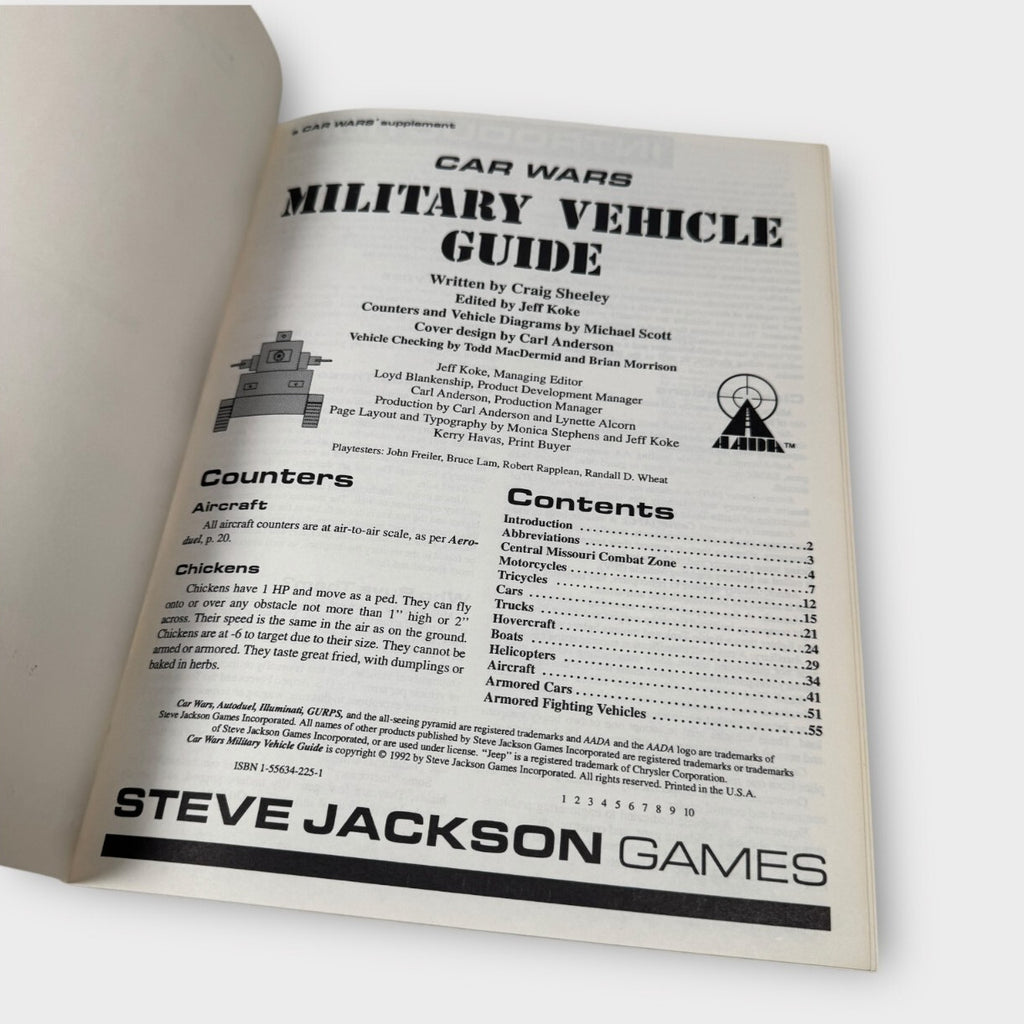 Dive into the world of post-apocalyptic skirmishes with the "Car Wars Military Vehicle Guide Book" by Steve Jackson Games. This uncut sourcebook from 1992 is a treasure trove for fans and collectors alike, offering a detailed look at the rugged universe of "Car Wars." Whether you're a gamer looking to expand your repertoire or a collector seeking to complete your set, this guide book is a must-have. It's packed with vibrant illustrations and comprehensive stats that bring the battlefield to life, ensuring your campaigns are anything but ordinary. Embrace the challenge and adventure with this classic RPG sourcebook.This product is in Used condition.