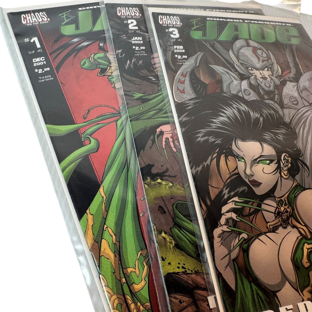 This lot features a complete four-issue single issue comic series "Chaos! Presents Jade: Redemption" numbered #1 through #4, published by Chaos! on the Edge. The series was released from December 2001 to March 2002 with a cover price of $2.99 each. The covers prominently feature the character Jade in a highly stylized, dynamic art style. Each issue includes detailed cover art and story arc branding "Redemption."