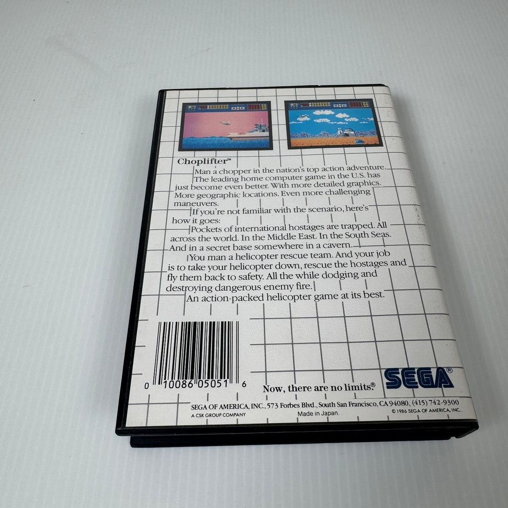 Experience the classic action and thrilling helicopter rescue missions with Choplifter for the Sega Master System. Originally developed under license from Broderbund Software, this game puts you in command of a helicopter rescue team tasked with saving international hostages from perilous locations including the Middle East, the South Seas, and secret underground bases. Navigate challenging geographic locations while dodging and destroying enemy fire in this action-packed adventure.
