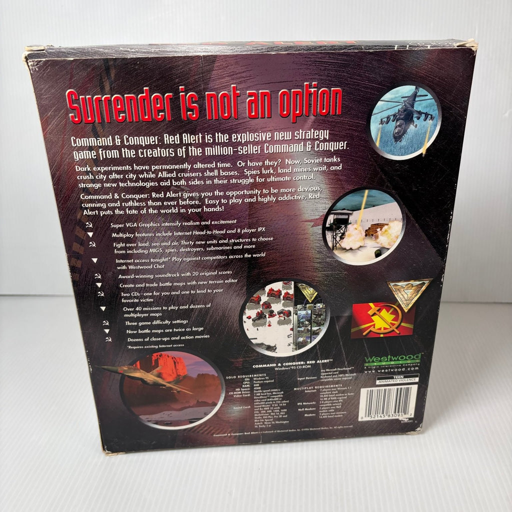 This original PC CD-ROM release for Windows 95 offers the complete Red Alert experience, including both the Allied and Soviet campaigns across two distinct discs. Dive into a rich narrative, engage in challenging skirmish battles, and utilize the included map editor to create custom scenarios. The game also features robust multiplayer options, allowing for thrilling head-to-head competition against other players. This edition comes in its original big box packaging, complete with the main game discs and an additional 'Command & Conquer Universe of Games' booklet, offering a comprehensive package for strategy game enthusiasts.This product is in Very Good condition.