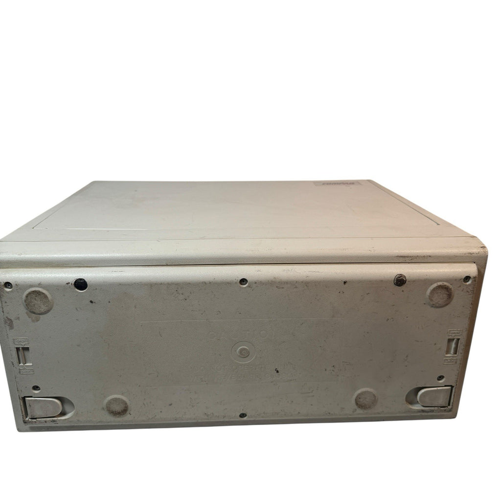 Unit does not power on. Includes one 5.25” floppy drive (upper bay) and a blank expansion cover (lower bay). The case shows age-related discoloration, scratches, and a crack on the side (see photos). Despite the crack, the keyboard still locks into place securely, and all feet are present. No power cord is included. There is some gapping in the side panels, so it appears it may have been previously opened. We have not opened it and are selling as is.