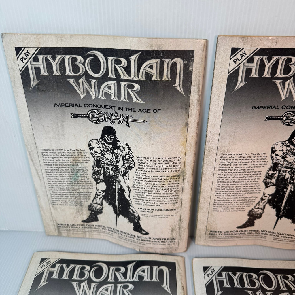 The Conan Saga follows the adventures of the iconic sword-and-sorcery hero Conan the Barbarian. Each issue prominently displays the Marvel logo and cover dates. Issue #59 features the story "The Valley of Vampires!"; #61 highlights "The Sword of Skelos! A Full-Length Thriller!"; #67 is titled "Return of the Conqueror"; and #68 continues the saga with "Conan's Wedding Night." The covers are illustrated with striking fantasy artwork, credited to artist Norem on at least one cover. The back covers include advertisements for the "Play Hyborian War" game, a play-by-mail game set in the Conan universe.