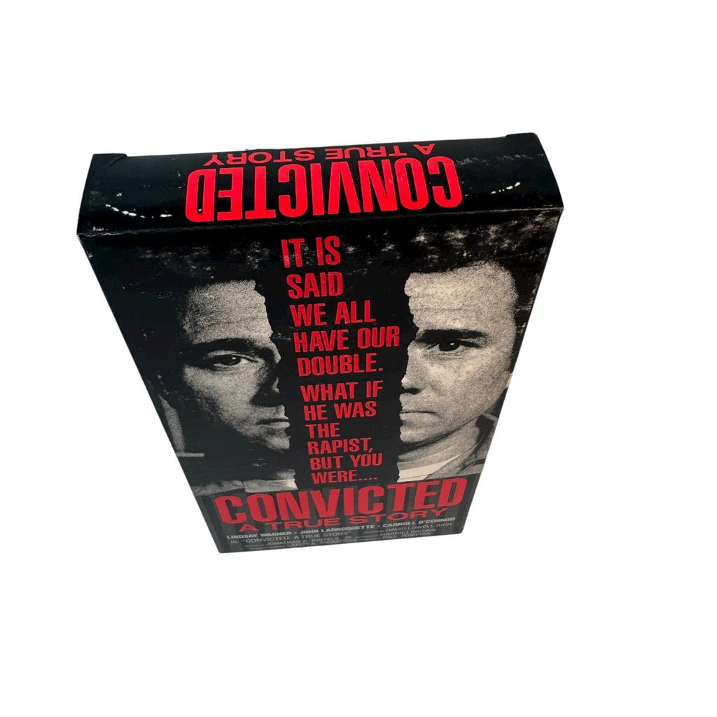 This 1986 VHS release from Turner Home Entertainment is presented in Hi-Fi Mono format with a runtime of approximately 94 minutes. The tape is color and plays on NTSC systems. The original packaging features stark black and red artwork with impactful imagery of the lead actors and a dramatic tagline emphasizing the story's intense premise. The box includes detailed synopsis and production credits on the back, along with a barcode and catalog number 6078. This original home video release is a must-have for collectors of true crime dramas and vintage VHS tapes.