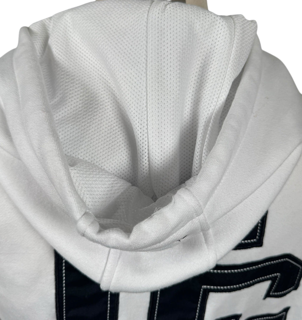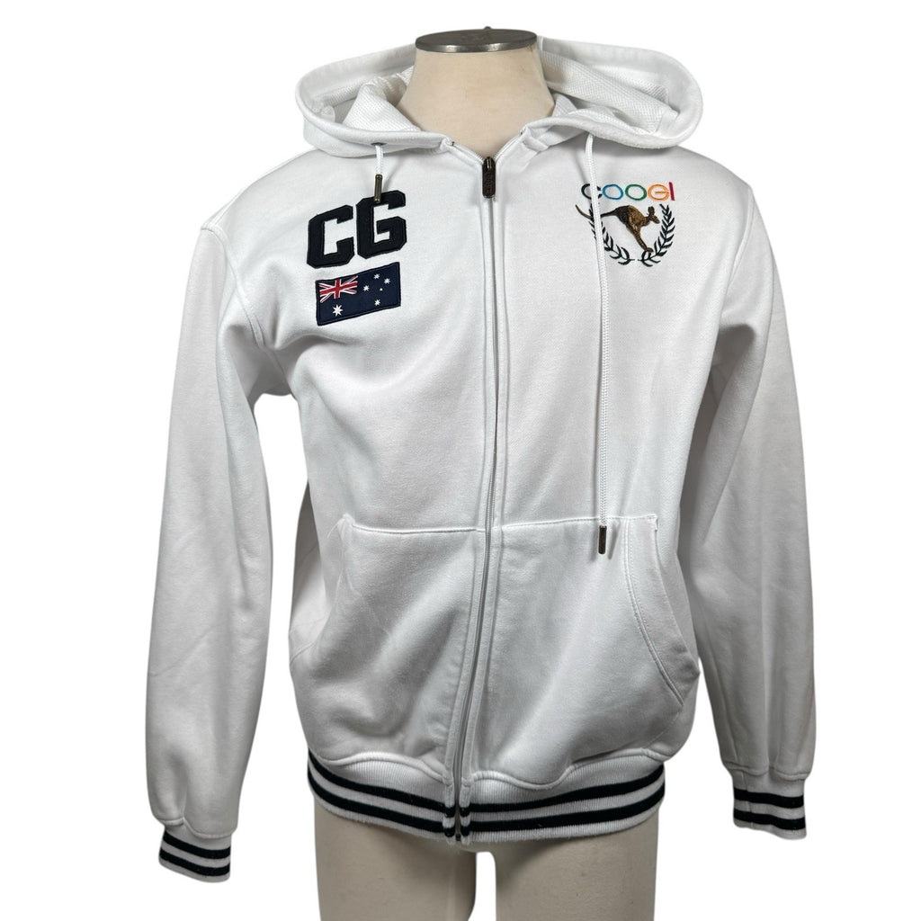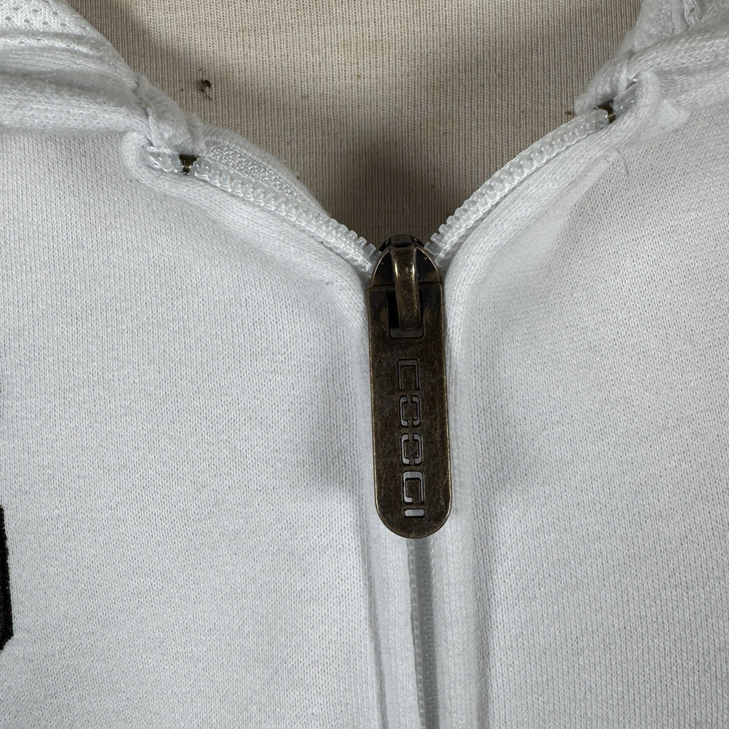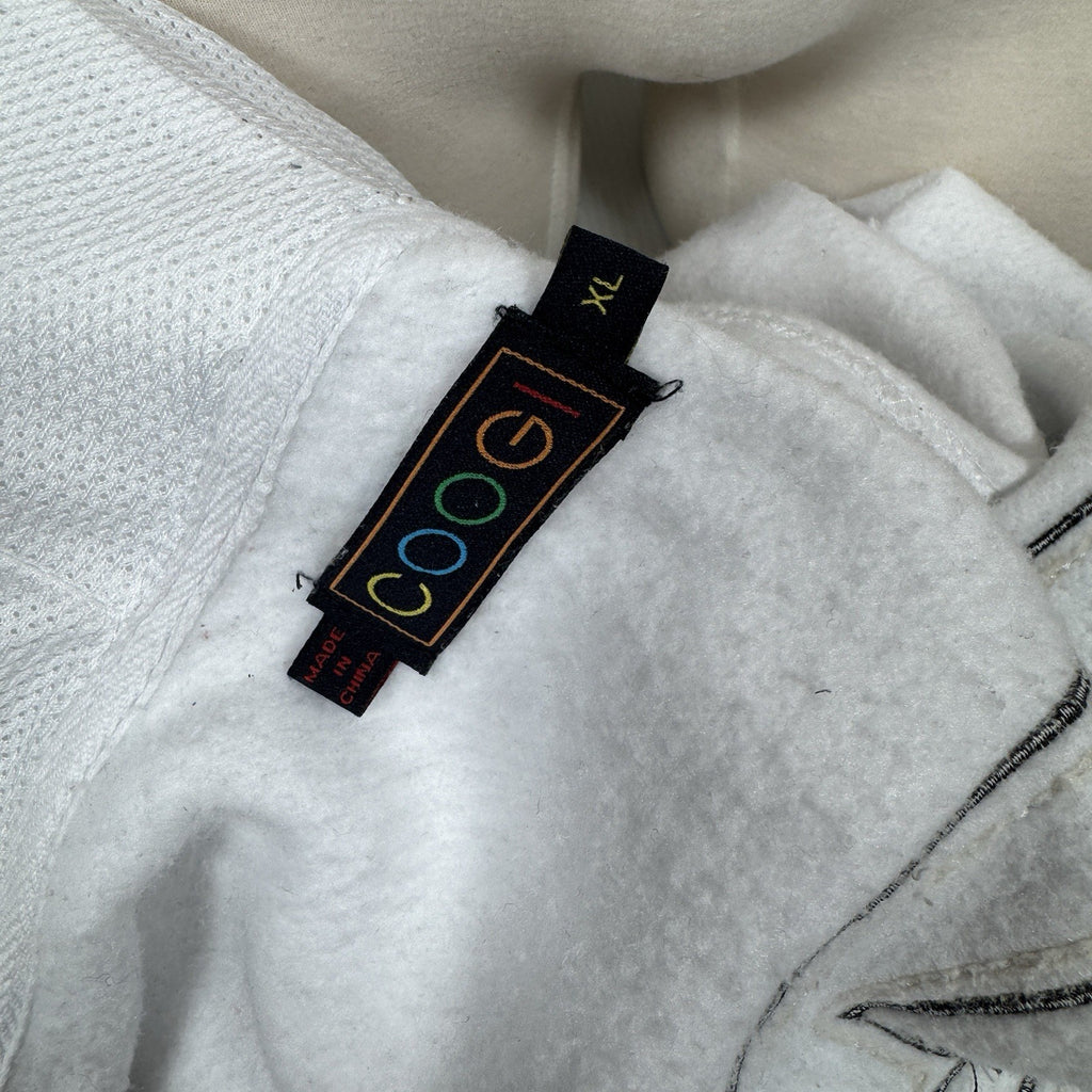 The Coogi Australia Zip-Up Hoodie is a vintage piece featuring intricate embroidery and a mesh lined hood, offering a stylish and comfortable option for men. Made from a blend of polyester and cotton, this white hoodie with long sleeves and a full zip closure is perfect for various activities such as gym training, walking, or soccer. With its 90s hip hop theme and colorful design, this regular fit hoodie from COOGI is sure to make a statement. Made in Australia, this XL size hoodie is a versatile and trendy addition to any wardrobe.