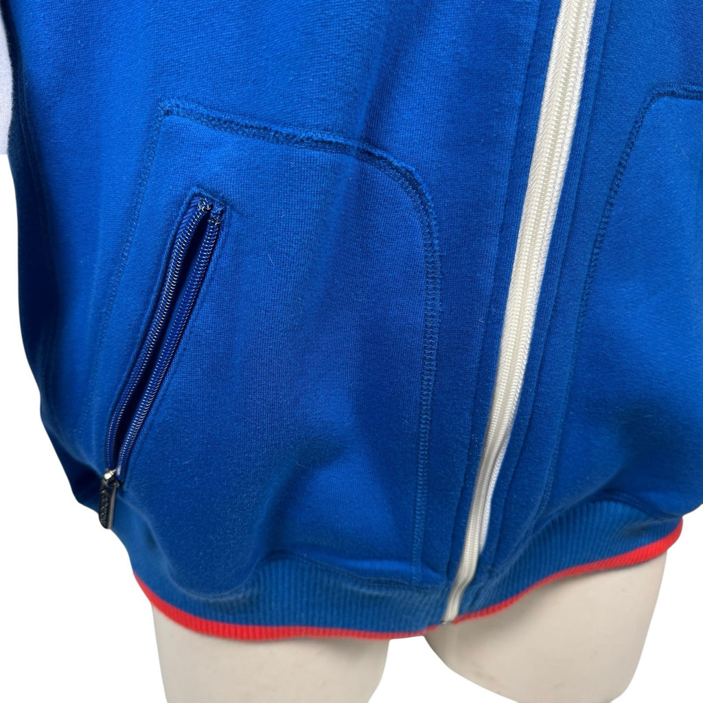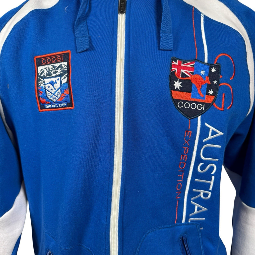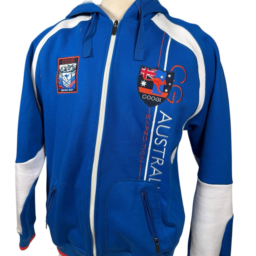 The Coogi Australia Zip-Up Hoodie is a vintage piece featuring intricate embroidery and a mesh lined hood, offering a stylish and comfortable option for men. Made from a blend of polyester and cotton, this white hoodie with long sleeves and a full zip closure is perfect for various activities such as gym training, walking, or soccer. With its 90s hip hop theme and colorful design, this regular fit hoodie from COOGI is sure to make a statement. Made in Australia, this XL size hoodie is a versatile and trendy addition to any wardrobe.