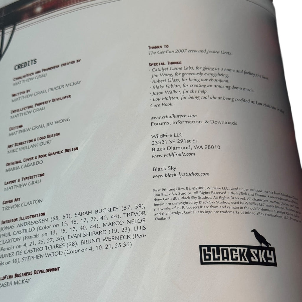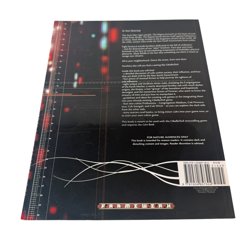 Designed by Matthew Grau and Fraser McKay, with cover art by Trevor Claxton, this 64-page supplement enhances your storytelling with story starters, hooks, and unique cult games to deepen your CthulhuTech experience. Its blend of cyberpunk and Lovecraftian horror themes makes it a must-have collectible for fans of the genre and RPG collectors. The book is printed in Thailand and includes a barcode with ISBN 978-1-934857-30-4, reflecting its quality production and official release.This product is in Used condition.