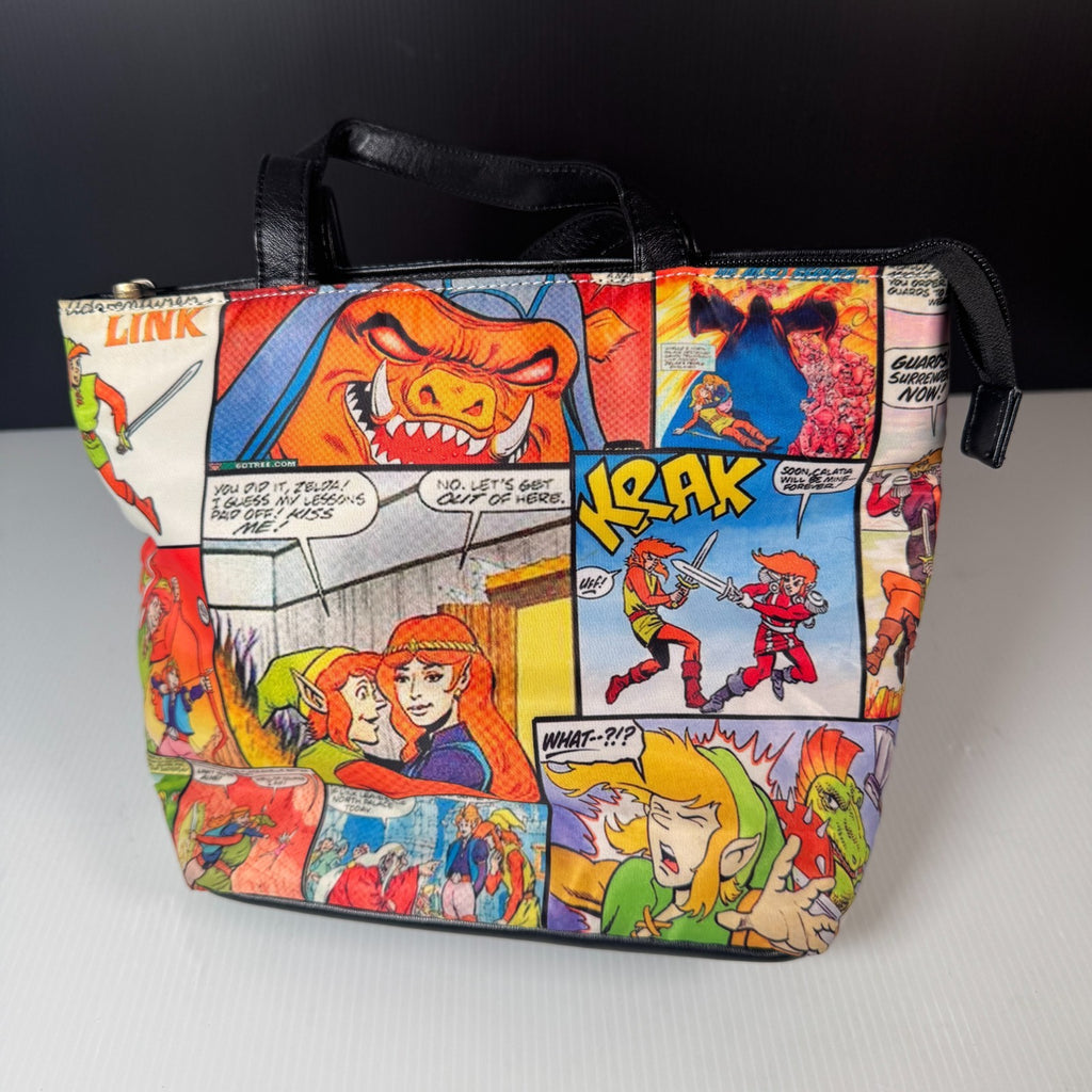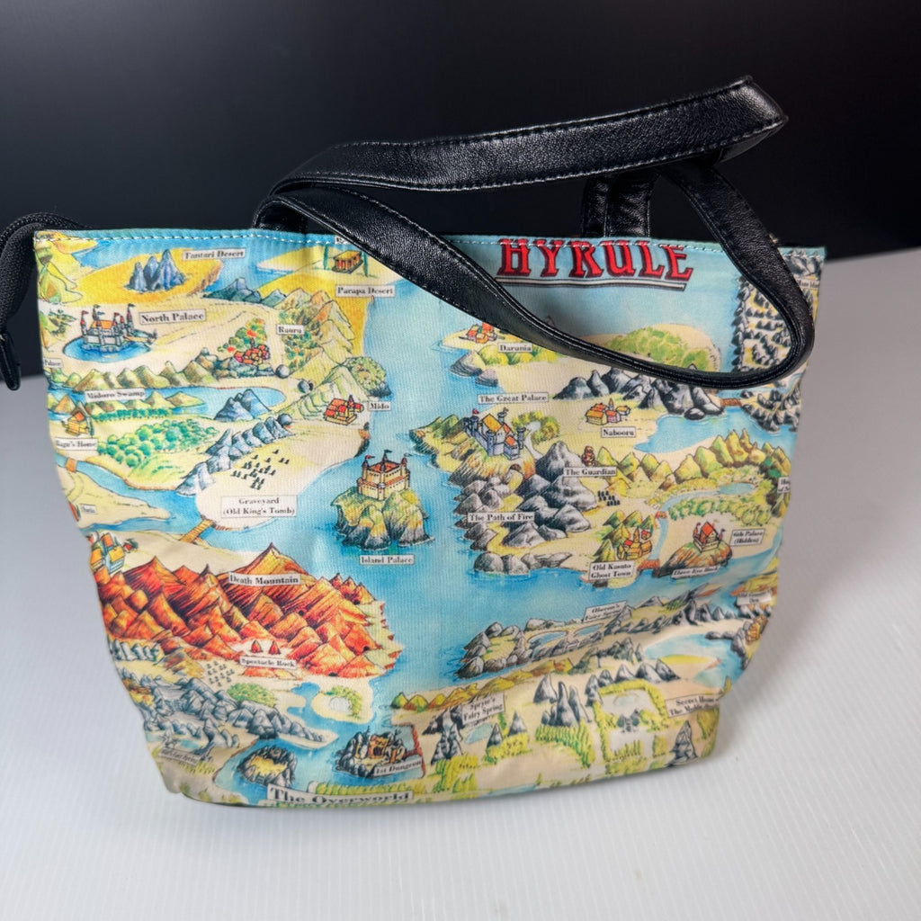 This Custom Hyrule Map Purse Handbag is a medium-sized shoulder bag featuring a multicolor Legend of Zelda comic print with the character Link. The black fabric lining complement the black leather top handle, making it a stylish and unique accessory for women. Perfect for fans of The Legend of Zelda series, this handbag is a functional and fashionable addition to any wardrobe.
