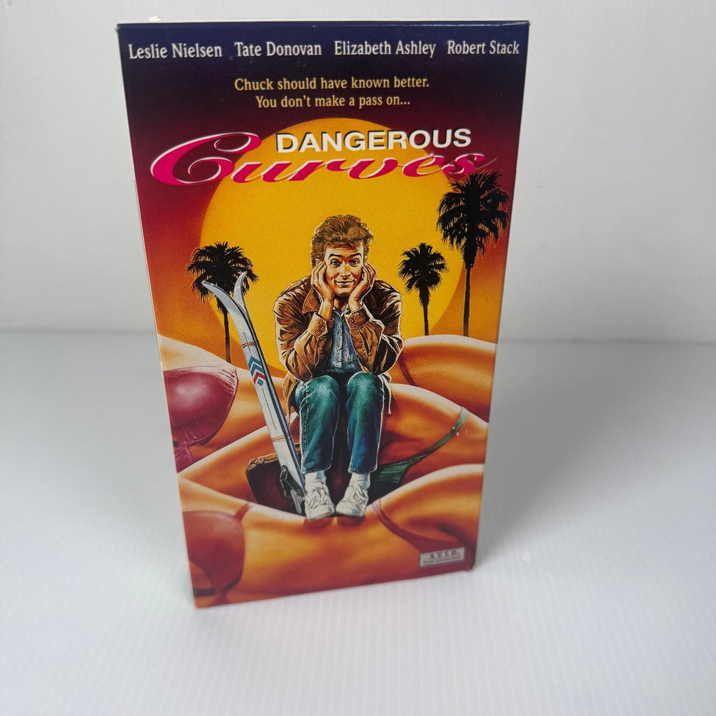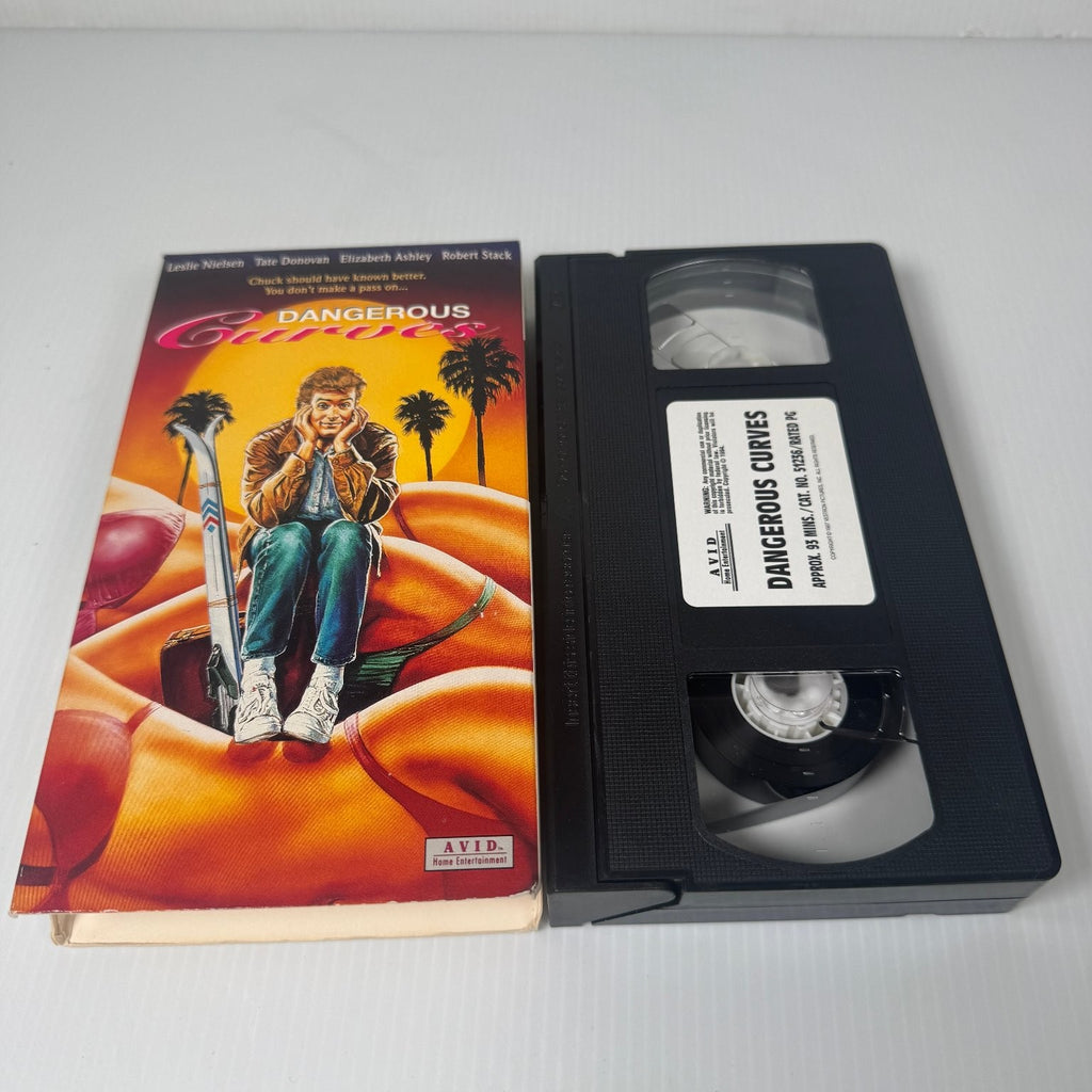 This original release VHS tape comes from Avid Home Entertainment and runs approximately 93 minutes. Presented in NTSC signal standard with English audio, it offers a classic VHS viewing experience. The packaging features vibrant artwork with Leslie Nielsen front and center, surrounded by the iconic 'Dangerous Curves' logo. This collectible VHS includes the original box and tape, making it a great addition for fans of 80s comedy films and VHS collectors alike.
