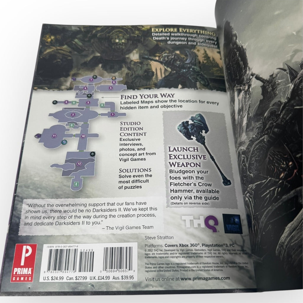 Explore the expansive world of "Darksiders II" with the Studio Edition Strategy Guide from Prima Games. This comprehensive guide is essential for fans looking to master every quest and secret in the acclaimed action-adventure game. The guide includes detailed maps, in-depth walkthroughs, and insider tips to help players navigate the complex lore and challenging gameplay that "Darksiders II" offers.