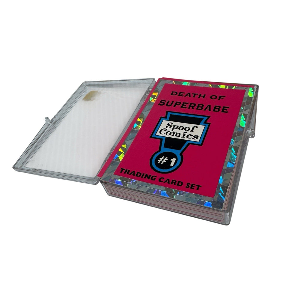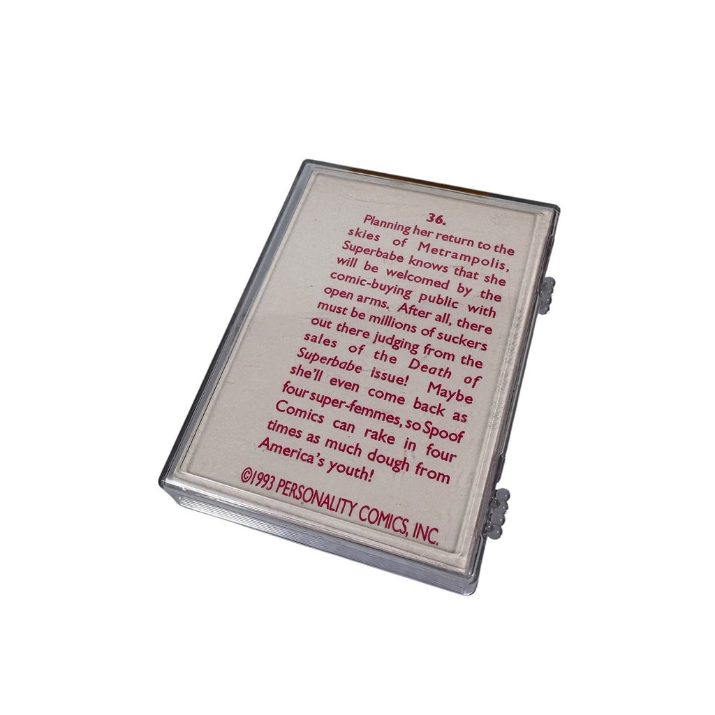 The "Death of SuperBabe Spoof Comics Trading Cards Complete 37 card set" from 1993 features standard-sized cards made of card stock. This original set, manufactured by Spoof Comics Trading Cards, includes 36 cards featuring the character Superbabe in a superhero, action, and fantasy genre. With a vintage feel and English language text, this non-sport trading card set is a must-have for collectors interested in unique and entertaining content from the early 90s.
