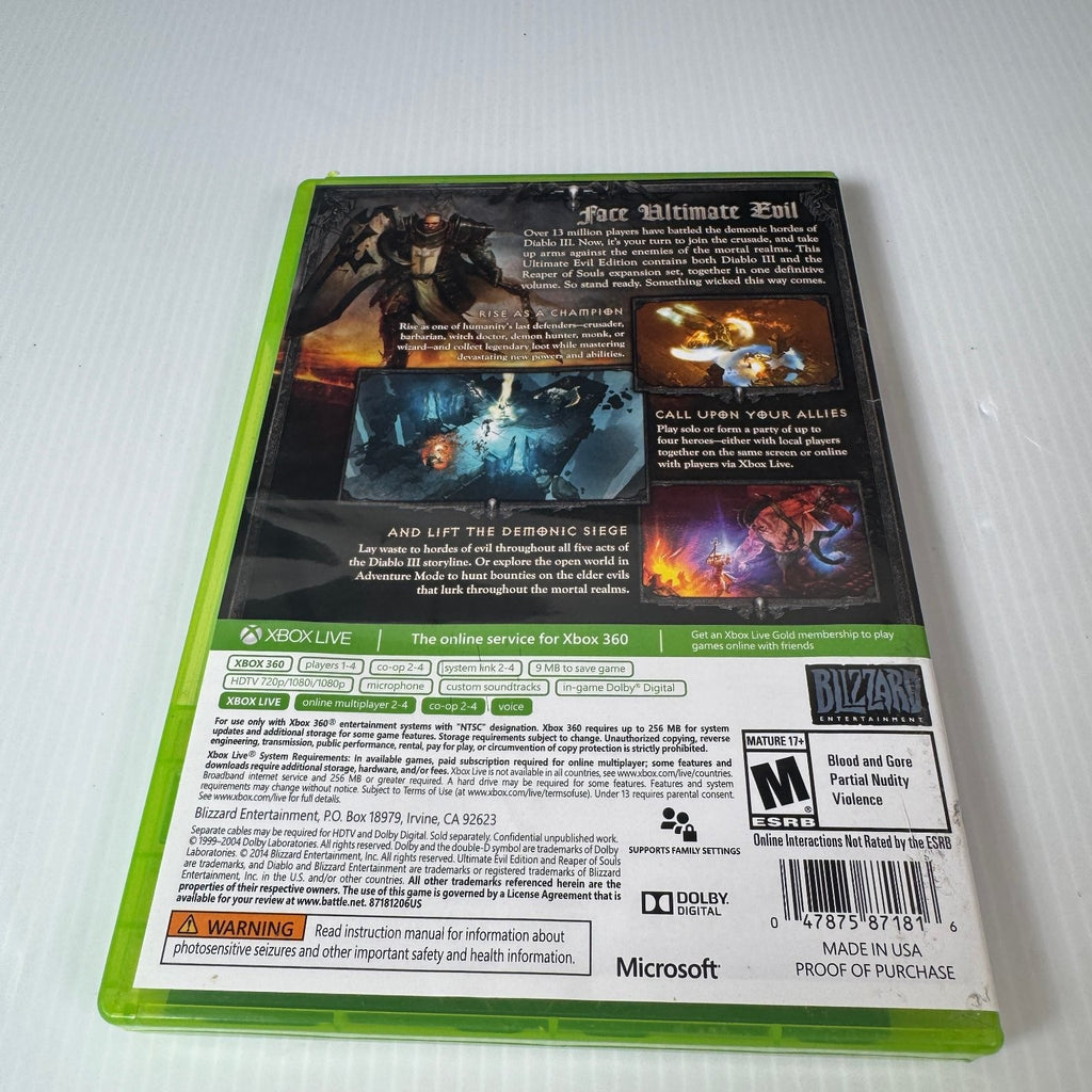 Diablo III Ultimate Evil Edition for Xbox 360 combines the base game Diablo III and its acclaimed Reaper of Souls expansion into a definitive edition full of dark fantasy adventure. Battle through all five acts of the Diablo III storyline, rising as one of humanity's last defenders with a choice of seven character classes including Crusader, Barbarian, Witch Doctor, Demon Hunter, Monk, and Wizard. Master new powers and collect legendary loot to battle the demonic hordes threatening Sanctuary.