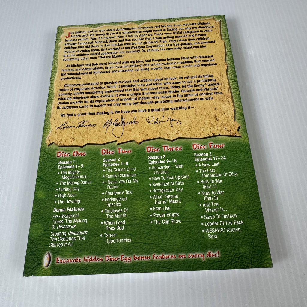 This special DVD edition includes 24 episodes across four discs, with bonus features such as "Pre-Hysterical Times: The Making Of Dinosaurs" and "Creating Dinosaurs: The Sketches That Started It All." The packaging features vibrant artwork with baby dinosaur characters and comes in a distinctive fold-out case. Each disc is clearly labeled with season and episode details, ensuring easy navigation. A fantastic collectible for fans of classic 90s television and Jim Henson's creative legacy.