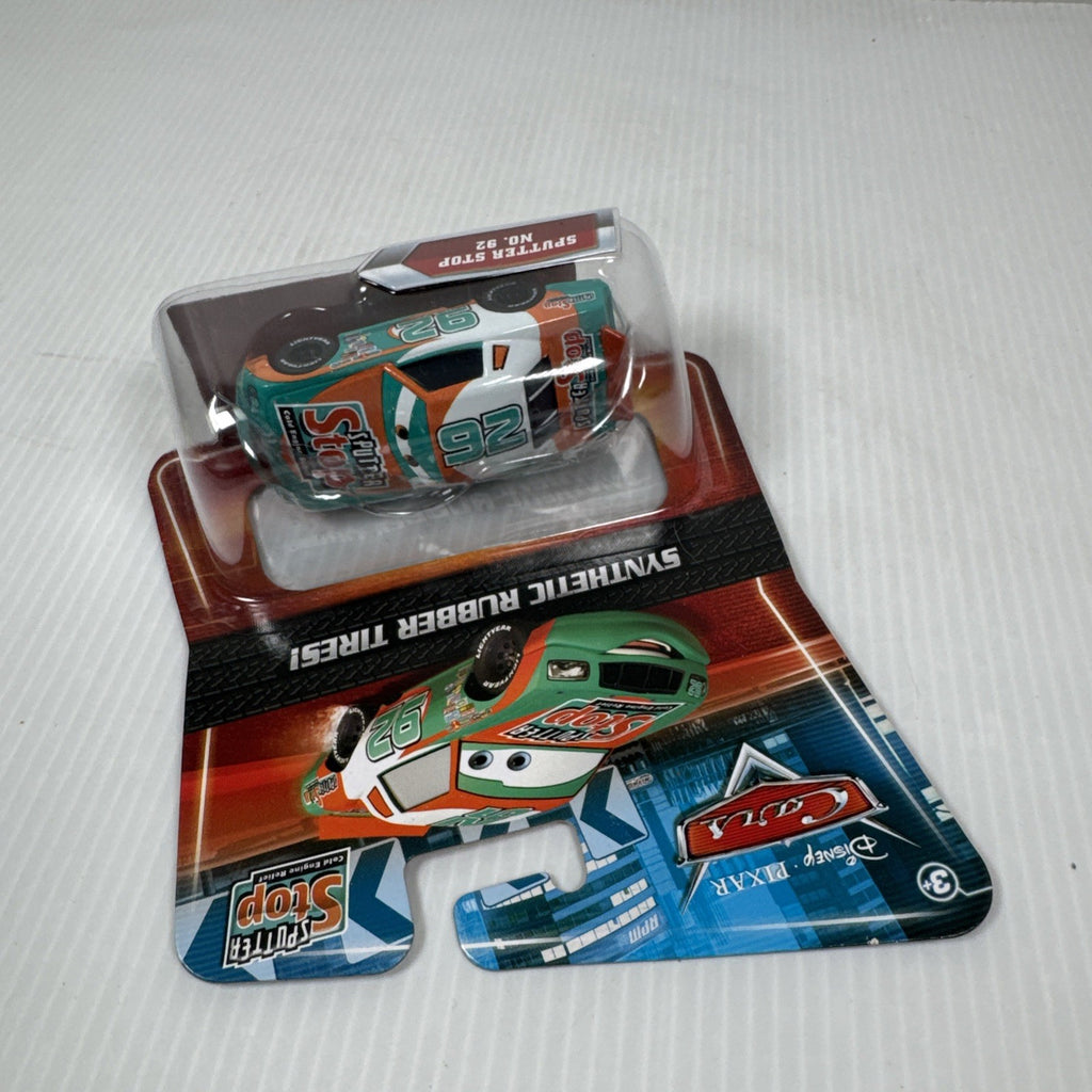 Disney Pixar Cars Sputter Stop No. 92 is a diecast toy car with synthetic rubber tires, produced by Mattel in 2008. It features multi-color design and is part of the Disney Pixar Cars character family.