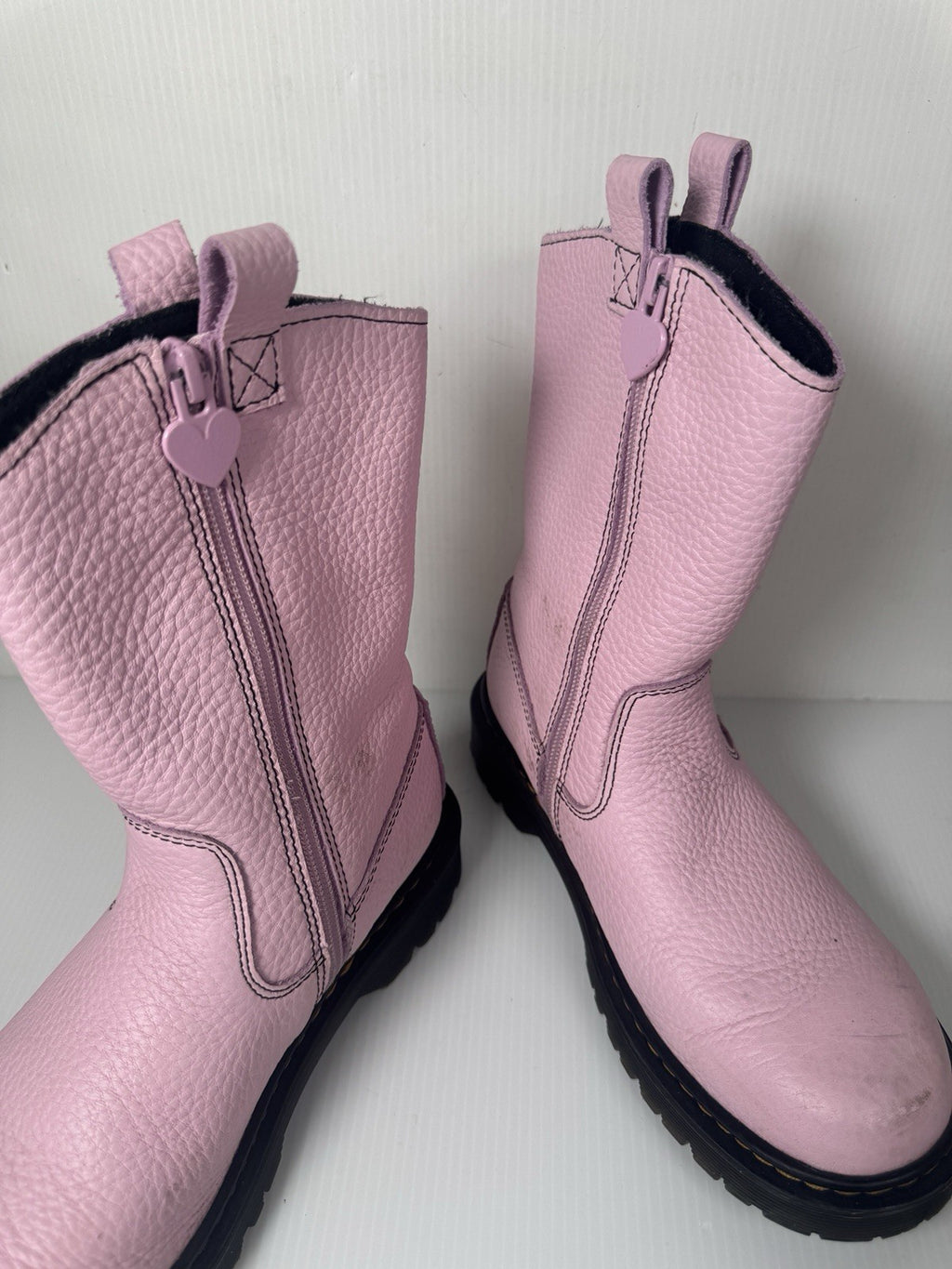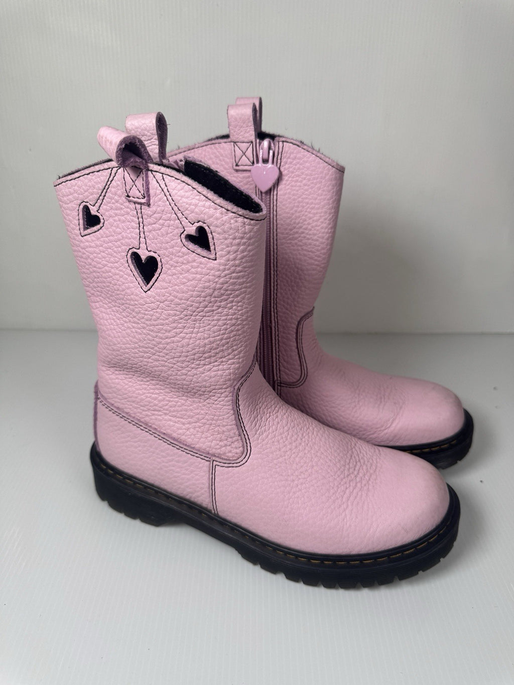 The Doc Martens Bex Heart P-O Boot in pale pink and black is a stylish and unique women's boot in size 5 (EU 36). Made by the renowned brand Dr. Martens, this boot features a cowgirl theme with a leather upper material. The pink color and striking design make it a standout piece for any outfit.