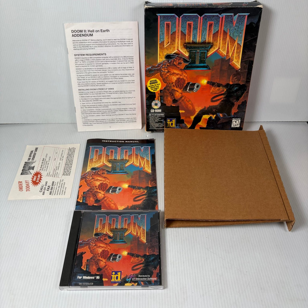 This comprehensive package includes the original big box packaging, the game CD-ROM, the essential Instruction Manual, and the 'DOOM II: Hell on Earth ADDENDUM' sheet, providing crucial details for multiplayer modes and system requirements. Also included is a flyer for 'The Official Strategy Guide'. A notable feature highlighted on the box is the inclusion of 200 new levels not found in the original DOOM, offering expanded content and fresh challenges for even seasoned players. Prepare for a relentless onslaught of action, exploration, and explosive combat as you fight to save humanity from the forces of hell. This iconic title is a must-have for collectors and fans of retro PC gaming and the shooter genre.This product is in Very Good condition.