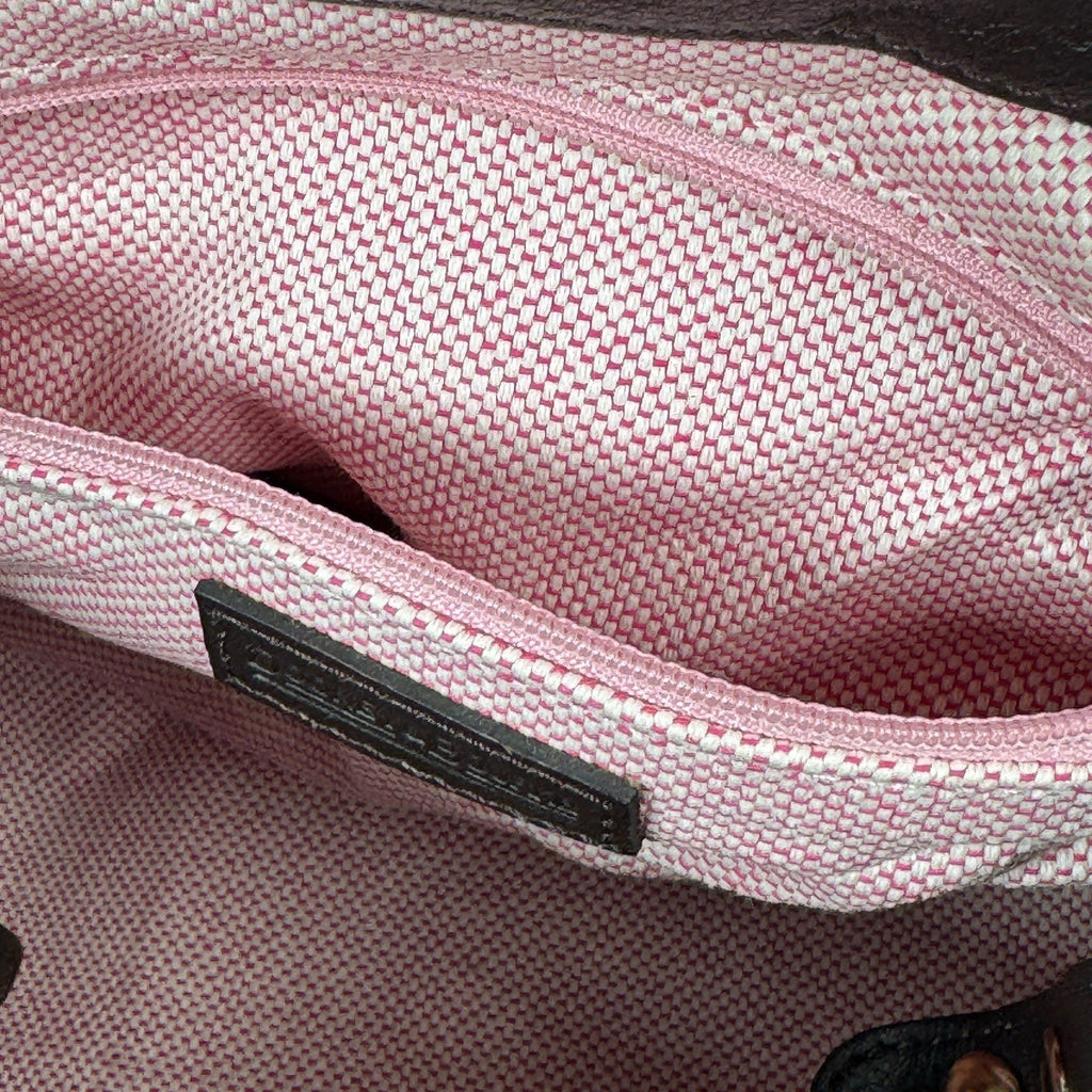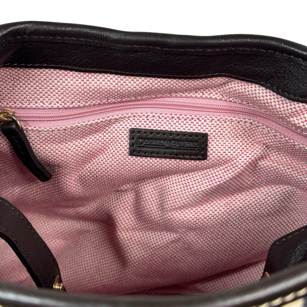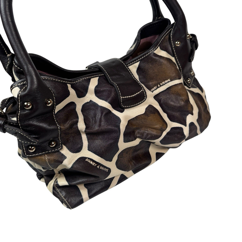 The Dooney & Bourke Giraffe Print Leather Satchel Handbag Purse is a stylish and versatile accessory for women. Made from high-quality leather with a unique animal print giraffe pattern, this medium-sized bag features a clasping hook closure and dark brown leather handles/straps. The bag also includes bottom studs for added durability and a pink fabric lining for a pop of color. Perfect for everyday use, this satchel from the Dooney & Bourke Giraffe product line combines fashion and function with its chic design and practical features.
