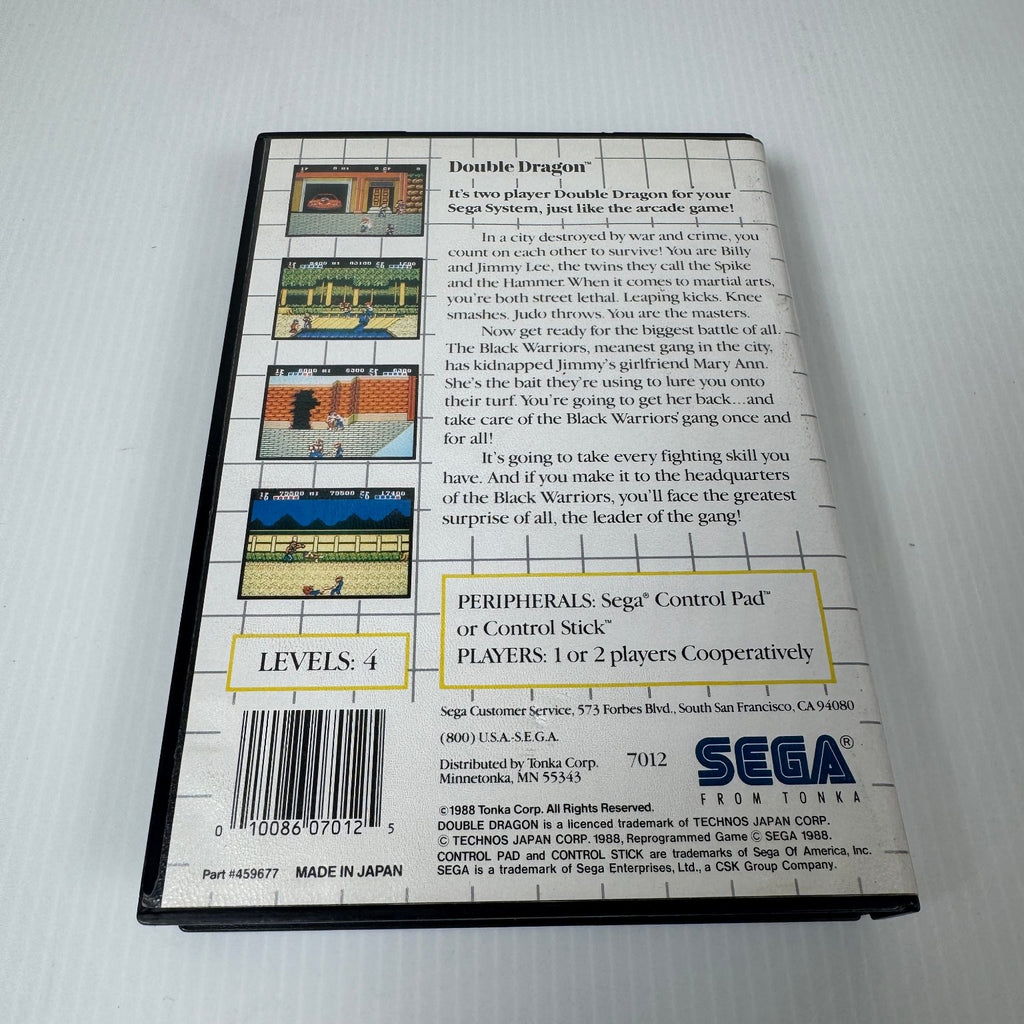 This original Sega Master System cartridge includes the iconic red label and comes with the original case showcasing the classic cover art of the two brothers fighting enemies in a gritty urban setting. Compatible with both Sega Control Pad and Control Stick peripherals, Double Dragon offers a faithful adaptation of the arcade hit, perfect for fans of retro fighting games and cooperative multiplayer action.This product is in Good condition.
