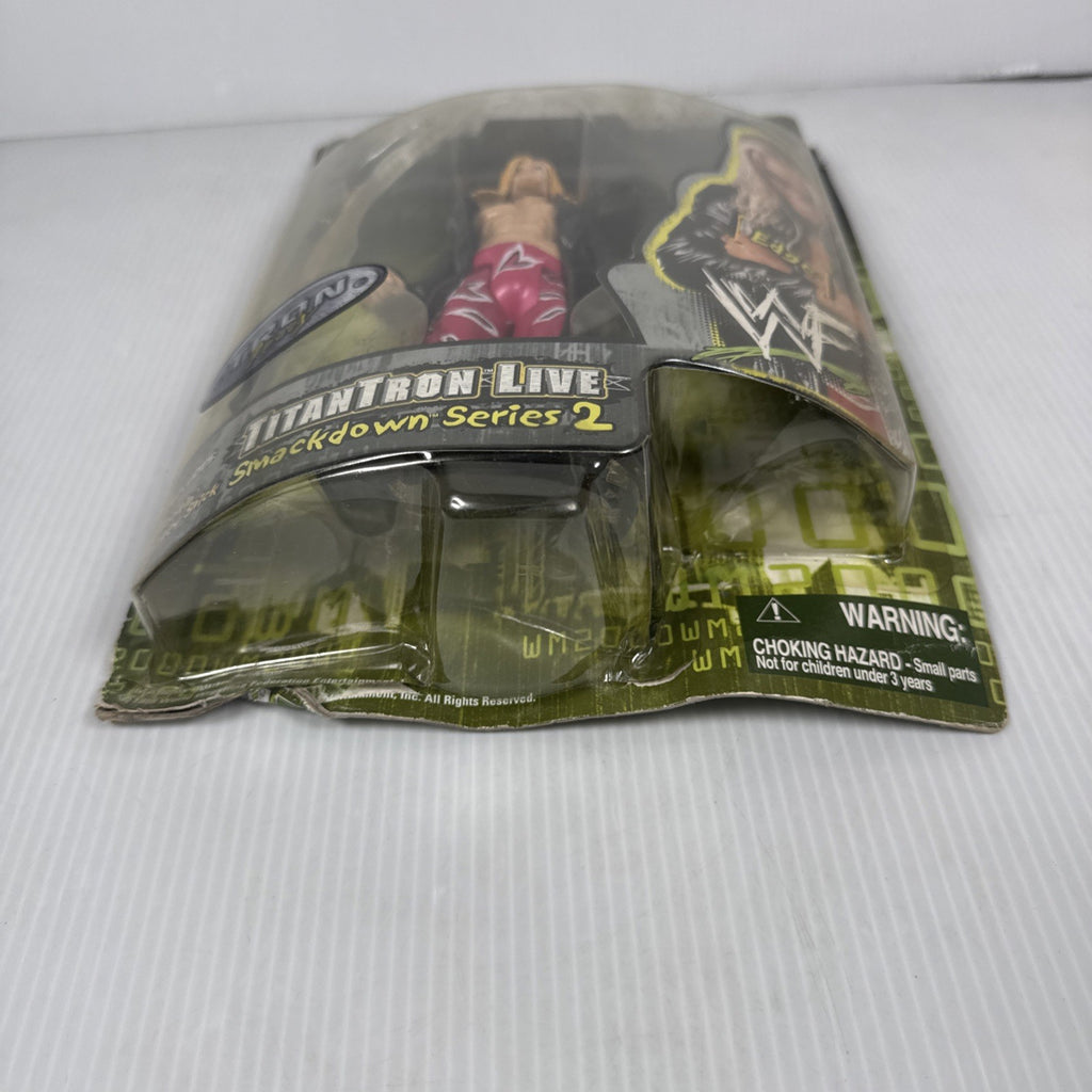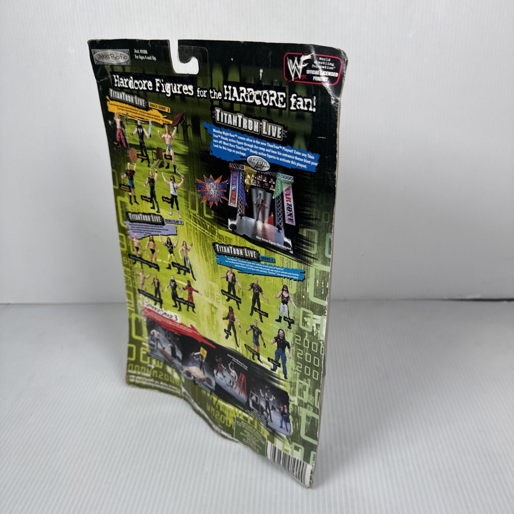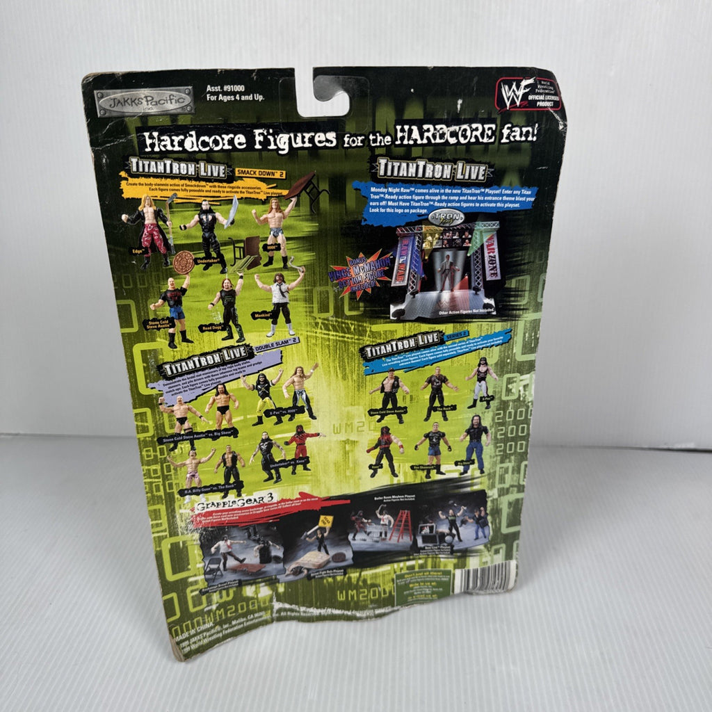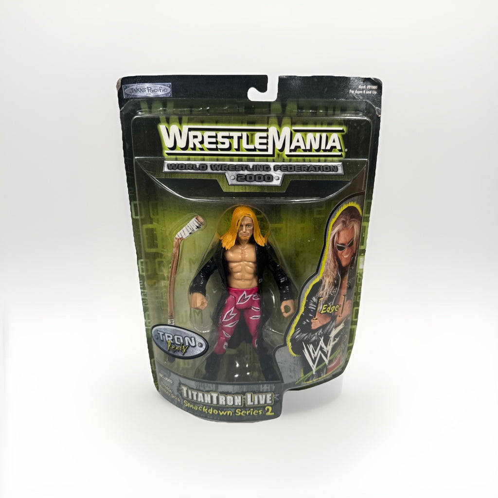 The product is a 7-inch WWF action figure of wrestler Edge, part of the Wrestlemania 2000 series by JAKKS Pacific. This collectible item features the wrestler in his Titantron attire, ready for intense wrestling matches. Made in China, this action figure is a must-have for fans of wrestling and Edge, showcasing intricate details and vibrant colors for an authentic wrestling experience.This product is in Used condition.