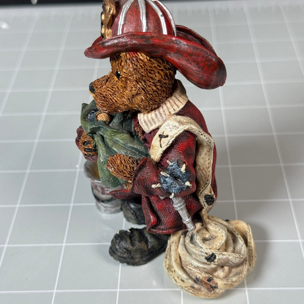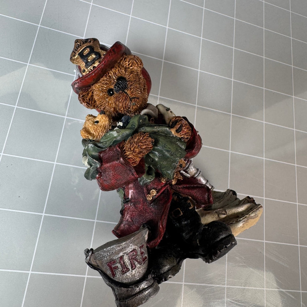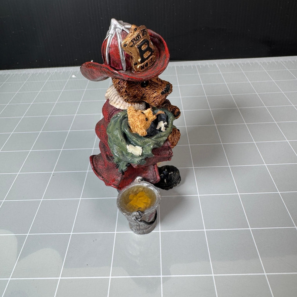 This collectible resin statue features Elliot The Hero from the Boyds Bears & Friends collection, specifically the Beatstone Collection. The figure depicts a bear dressed in a red firefighter coat and hat, holding a smaller bear wrapped in a green blanket. Included is a detailed silver bucket labeled "FIRE". The statue is handmade and numbered 3E/178, indicating its limited edition status.