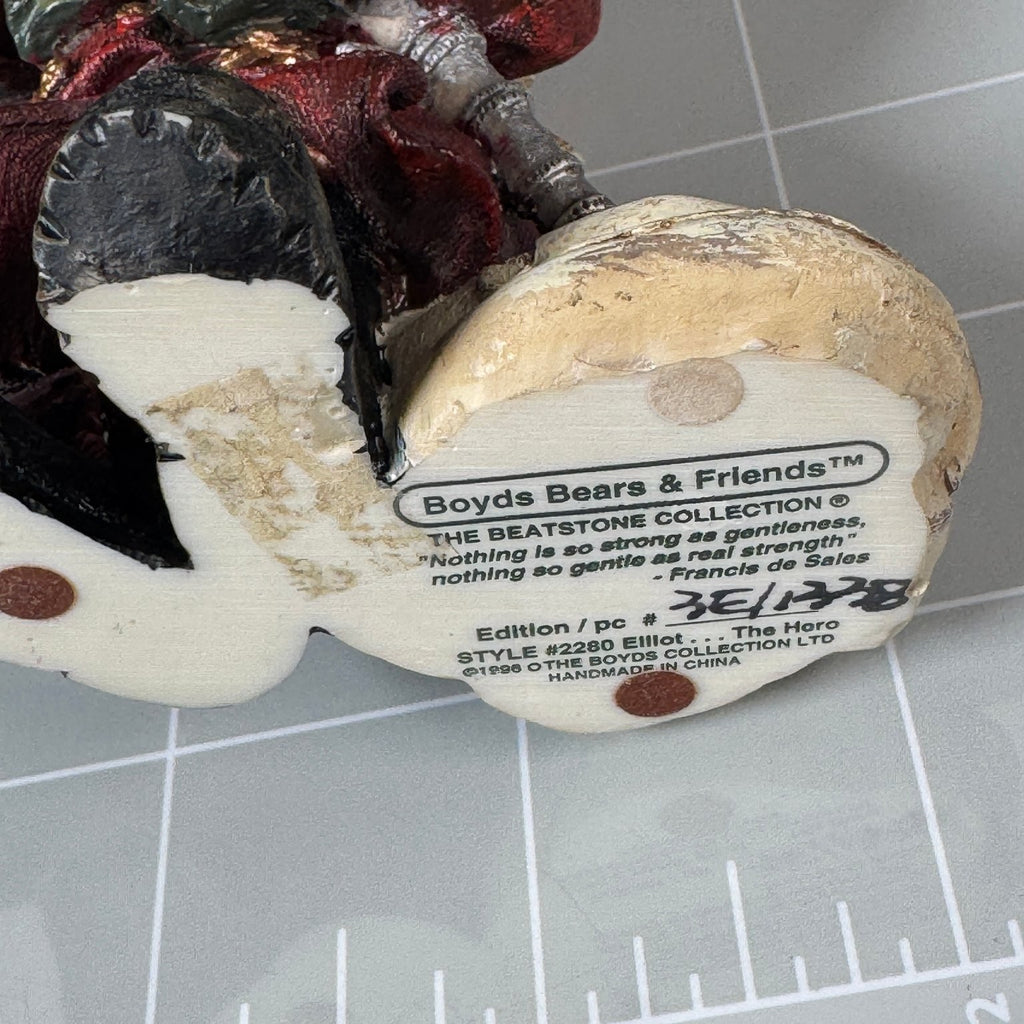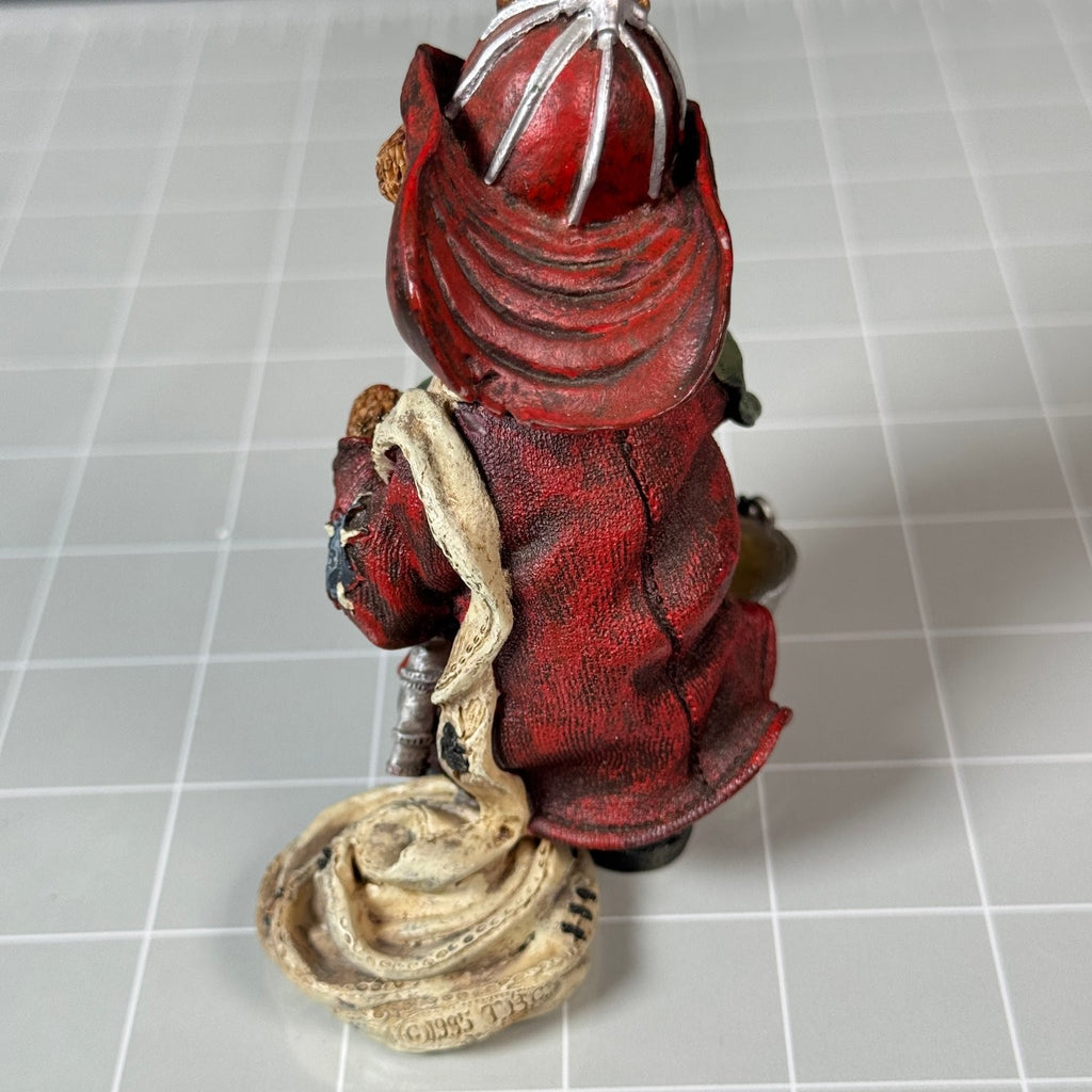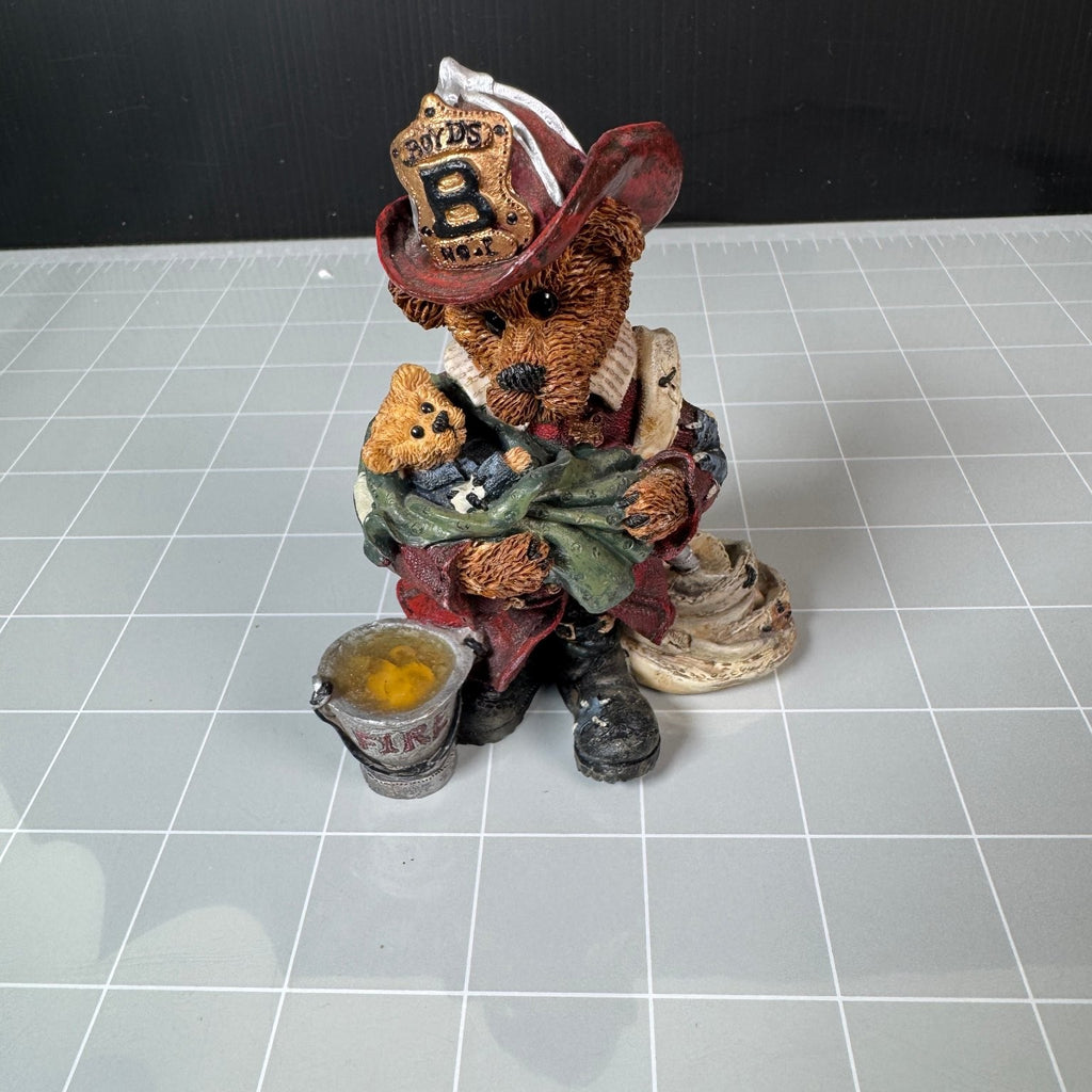 This collectible resin statue features Elliot The Hero from the Boyds Bears & Friends collection, specifically the Beatstone Collection. The figure depicts a bear dressed in a red firefighter coat and hat, holding a smaller bear wrapped in a green blanket. Included is a detailed silver bucket labeled "FIRE". The statue is handmade and numbered 3E/178, indicating its limited edition status.