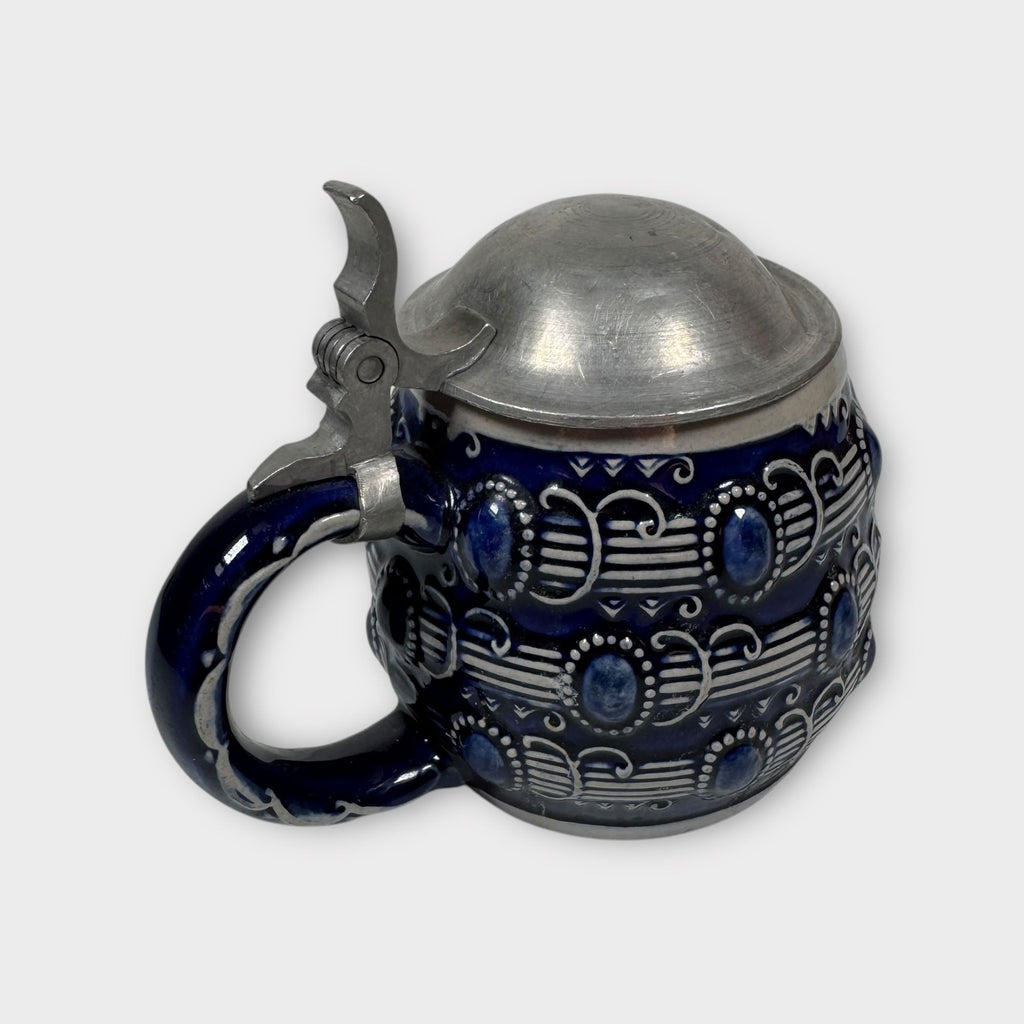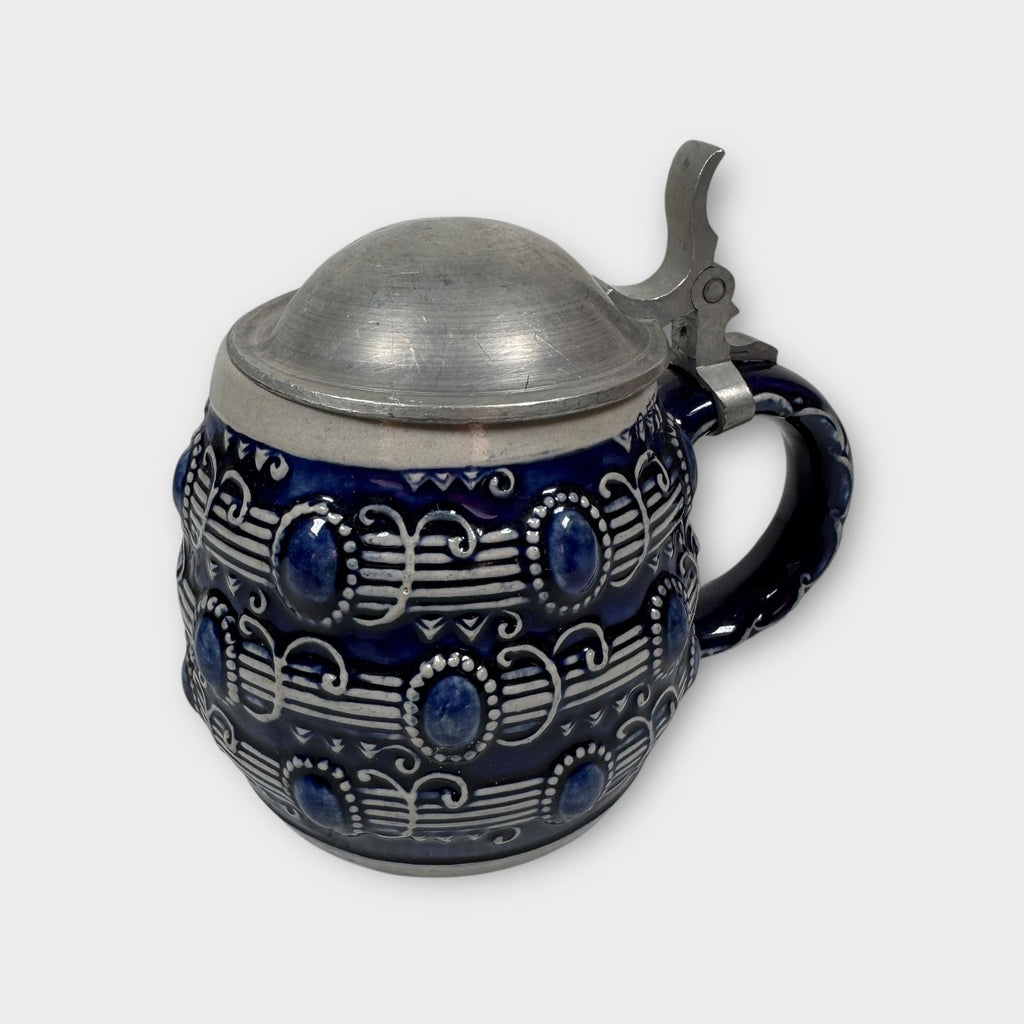 This vintage German stein, crafted in Höhr-Grenzhausen by Reinhold Merkelbach, whispers tales of old-world charm. Its blue ceramic body, adorned with intricate patterns and a sturdy pewter lid, evokes a sense of timeless tradition. A piece rich in character, it stands as a testament to skilled craftsmanship and cultural heritage.
