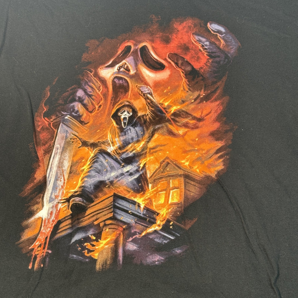 Front print depicts Ghost Face character from the Scream movie franchise with house on fire background