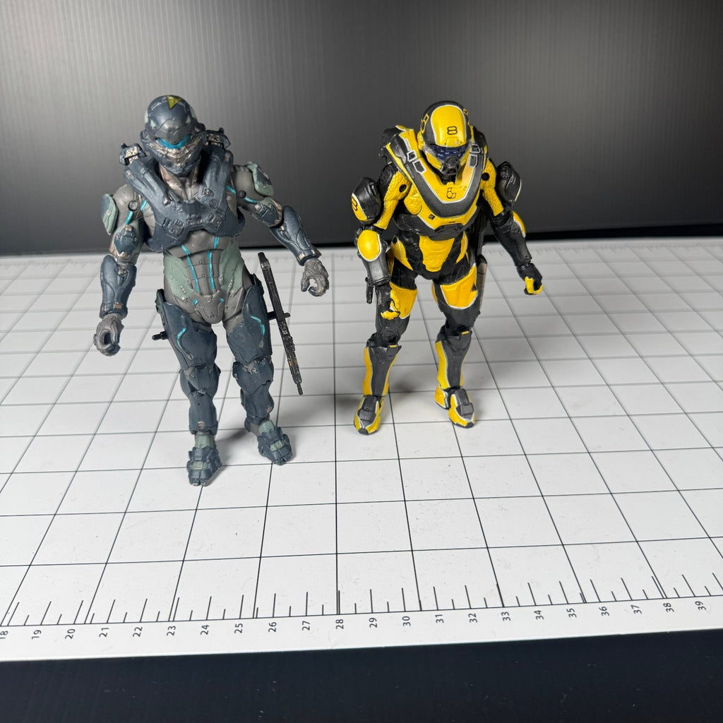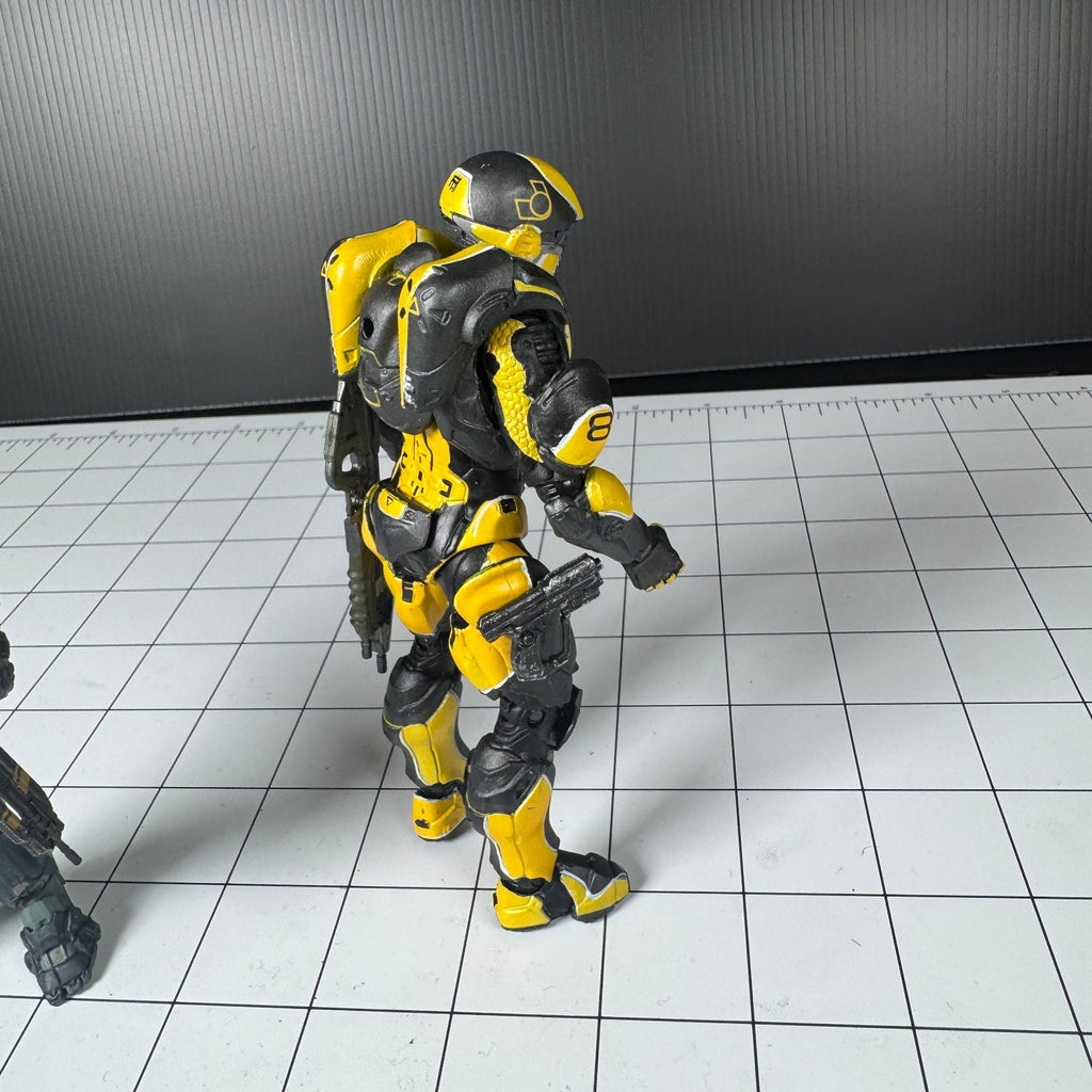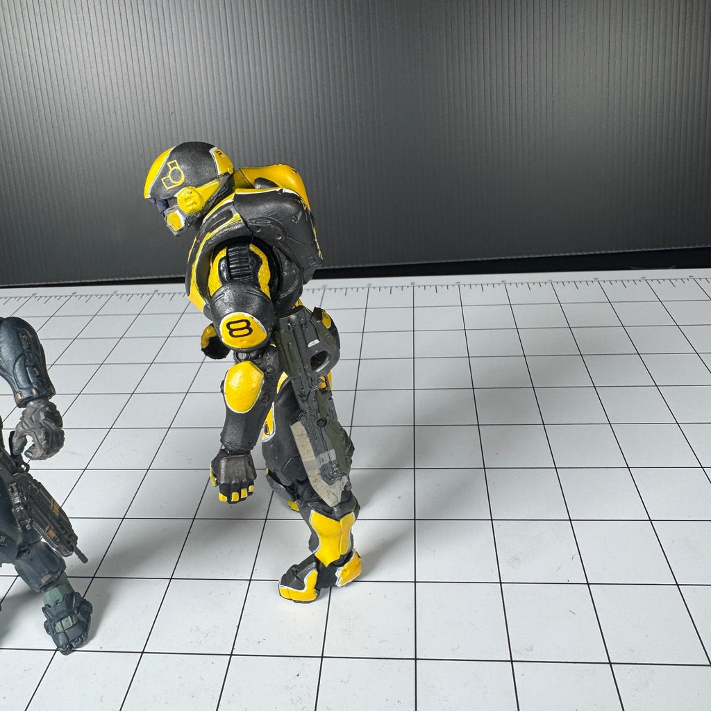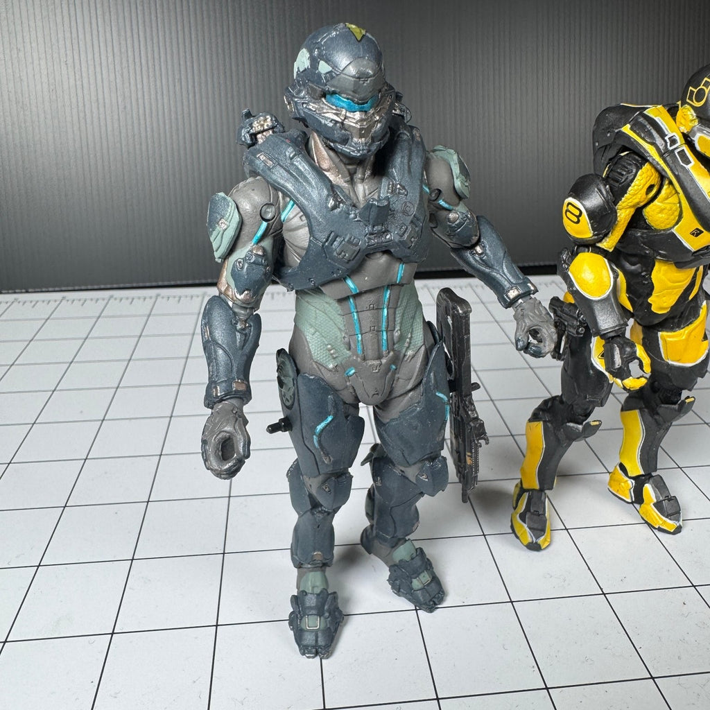 This listing features two highly detailed action figures from the Halo Infinite series. Representing Spartans in sleek, futuristic armor, these figures stand approximately 5.5 inches tall and showcase intricate sculpting and paintwork that capture the essence of the popular Halo franchise. The yellow and black armor on one figure contrasts sharply with the dark gray and teal tones on the other, highlighting their unique designs and battlefield readiness.