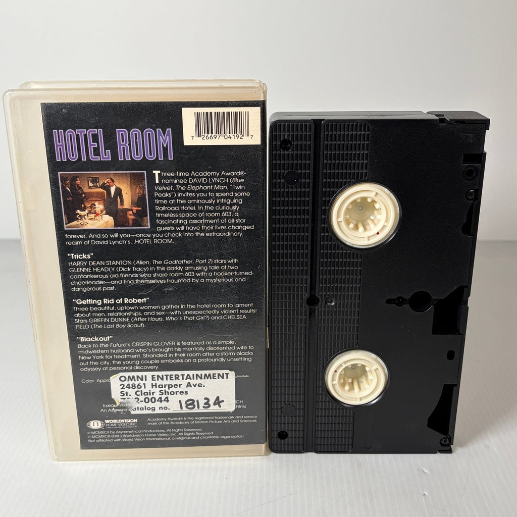 Step into the eerie and surreal world of David Lynch with this 1993 VHS release of 'Hotel Room'. Originally produced for HBO, this anthology series features three unsettling and atmospheric stories set entirely within room 603 of the Railroad Hotel in New York City. Lynch brings his signature dreamlike aesthetic to the small screen, directing the segments 'Tricks' and 'Blackout', which explore the bizarre lives and dark secrets of the hotel's rotating guests.