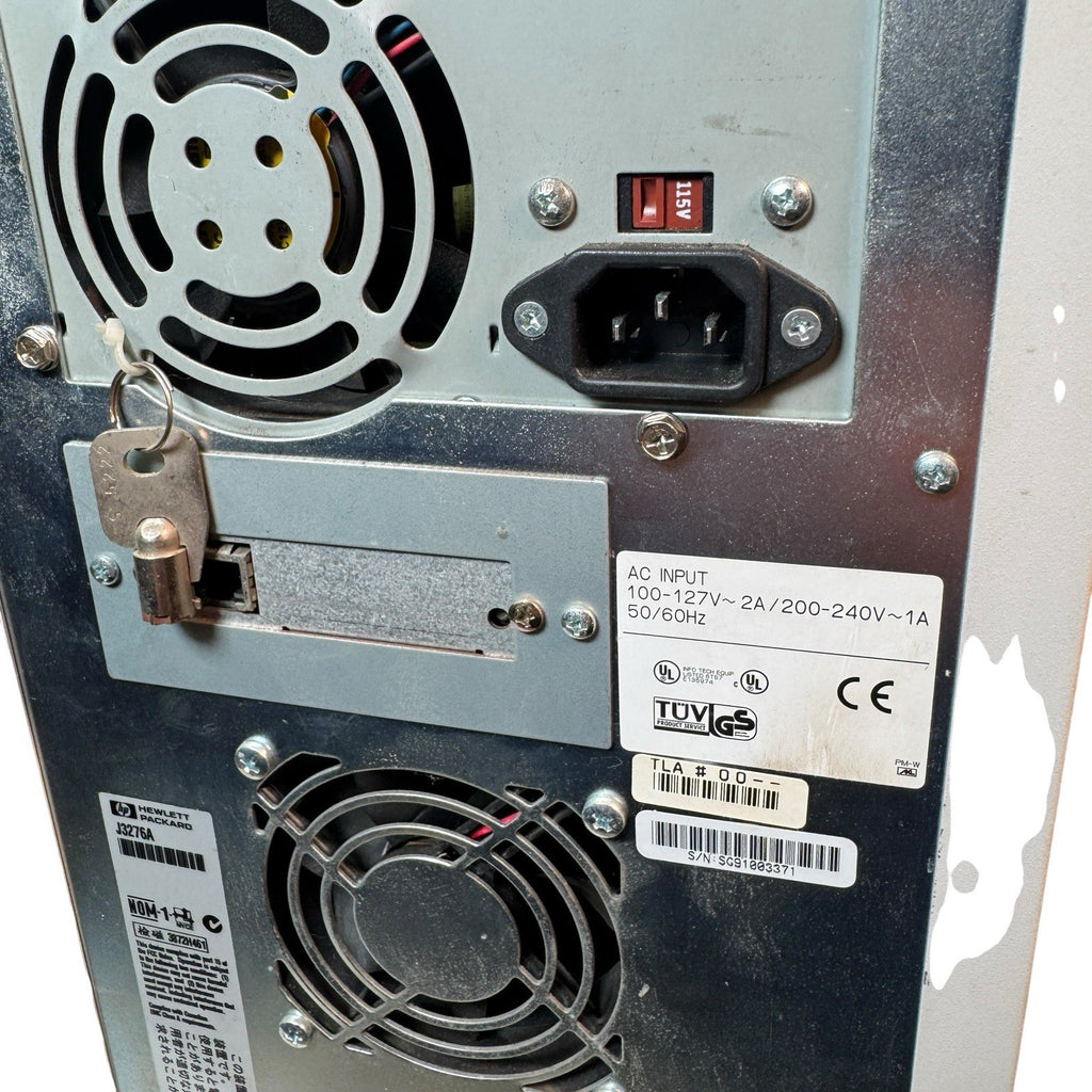 Unit powers on but shows wear consistent with age. The power button is missing; internally the system defaults to the “on” position. The outer shell is missing some screws. Includes six HP CD-32X drives (not seven as originally equipped). Of these, two drives eject properly and four do not. The front lock and key are present. No further testing has been performed; sold as-is for parts, repair, or collection.