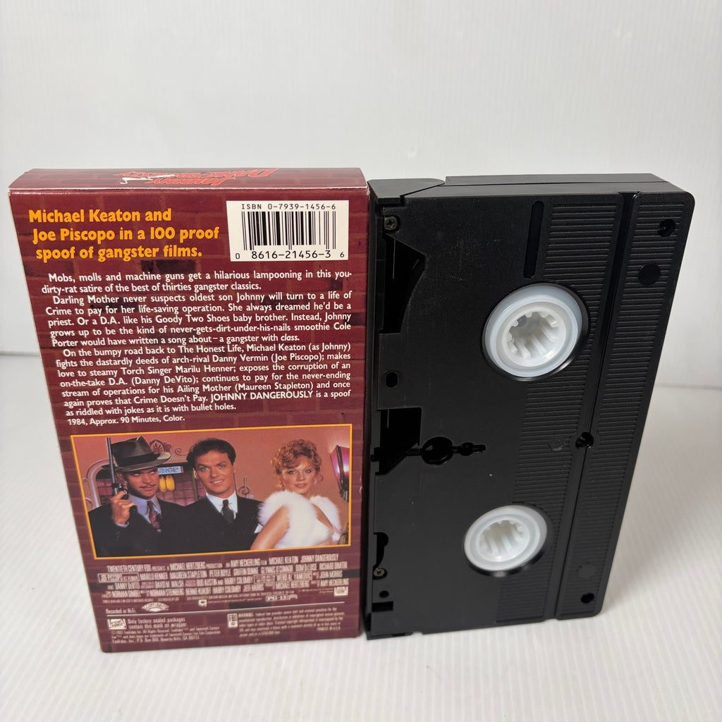 Step into the hilarious world of 1930s gangster spoofs with "Johnny Dangerously" on VHS. This classic 1984 comedy stars Michael Keaton as the titular character, a good-hearted man who turns to a life of crime to save his ailing mother. Joe Piscopo co-stars as the mob boss, Danny Vermin, creating a dynamic duo of comedic chaos.