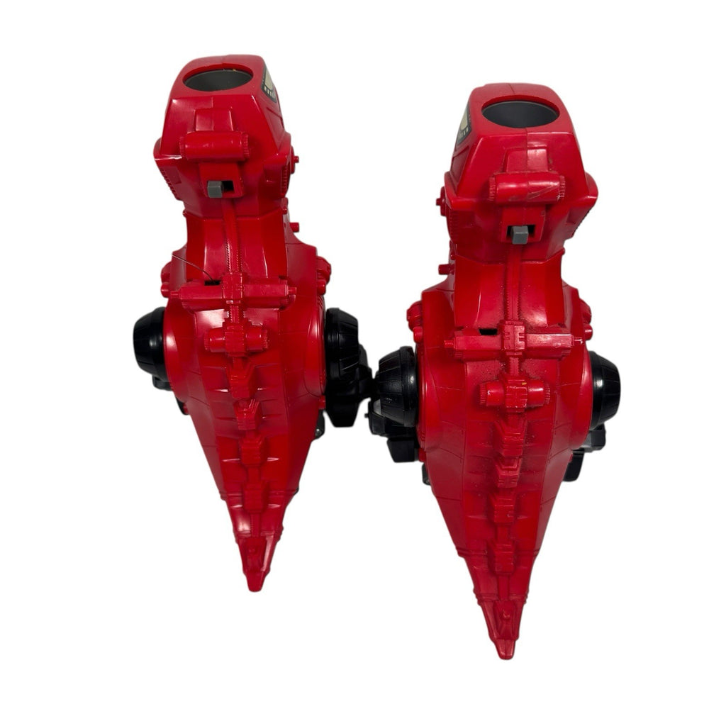 This is a set of two Starriors Deadeye T-Rex robots manufactured by TOMY in Japan in 1984. These robots are a sought-after collectible for fans of vintage toys and robots.