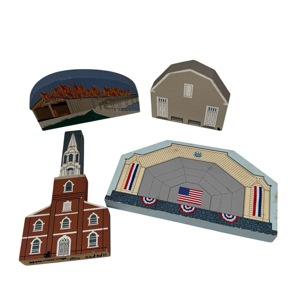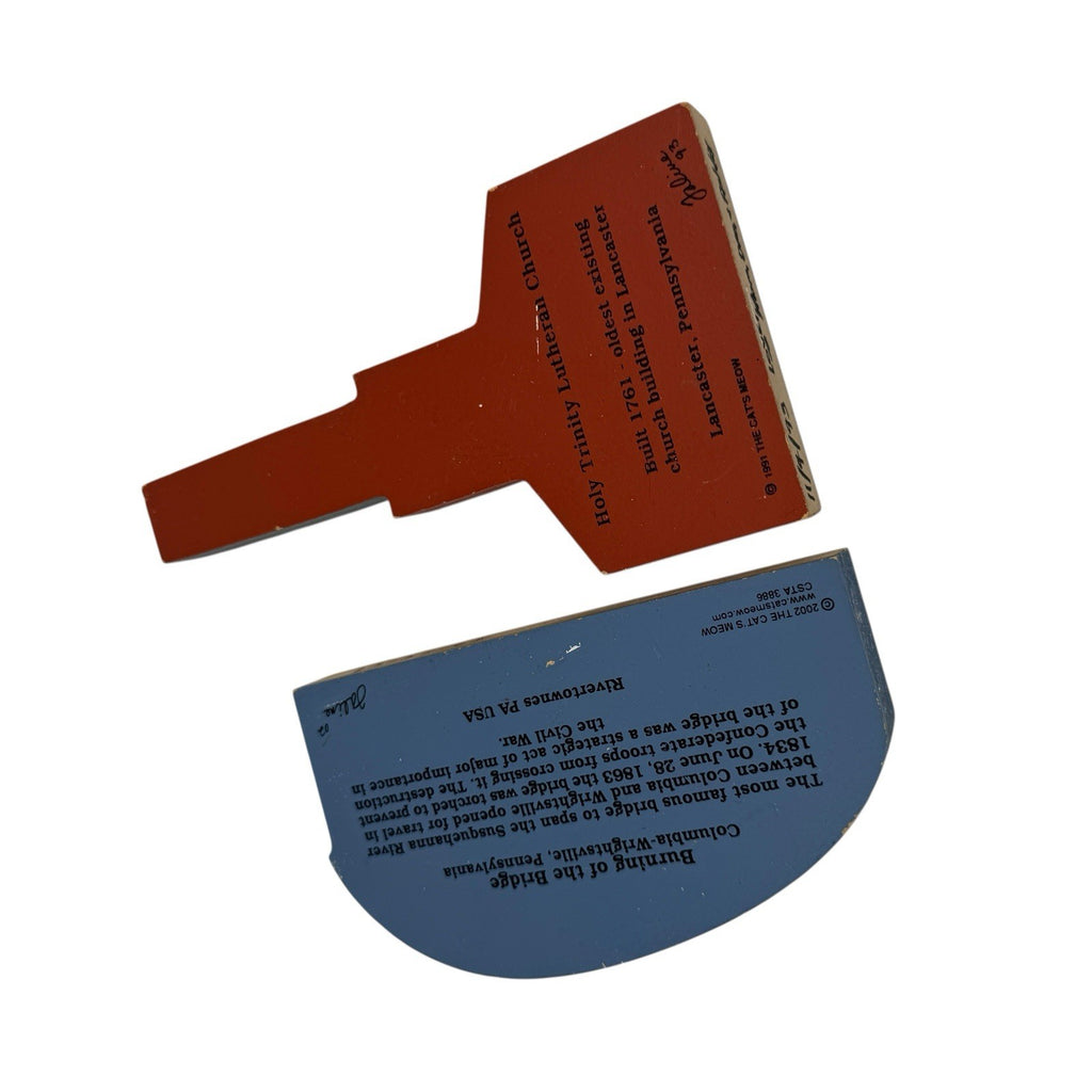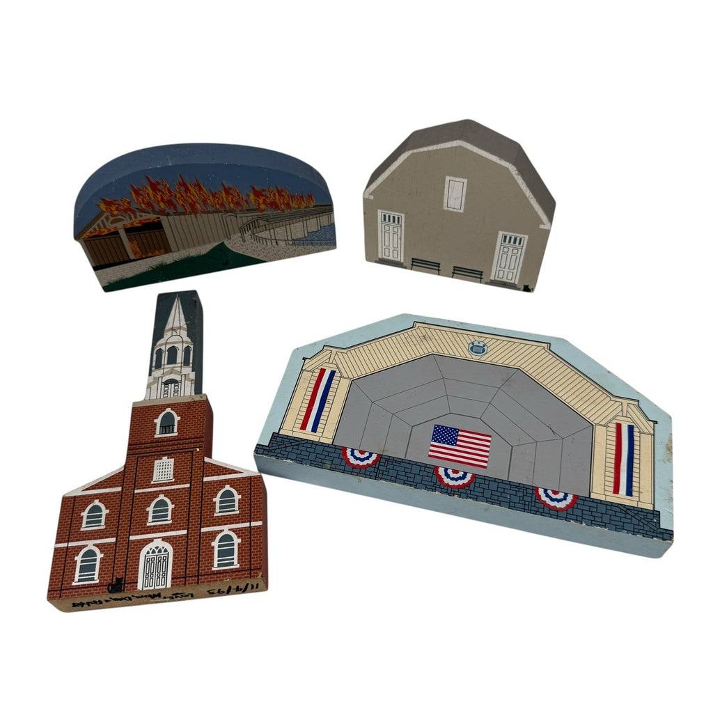 Add a touch of charm to your collection with this lot of four wooden houses, hailing from the nostalgic 90s and early 2000s. Crafted with care to show location surrounding Lancaster, PA each piece in this Classic Collection showcases the whimsy of Cat’s Meow & other designers, sure to delight enthusiasts and collectors alike.