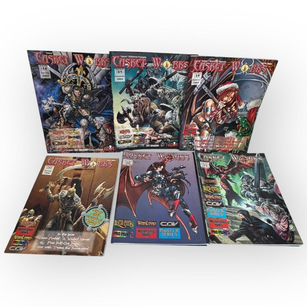 This lot includes six issues of Casket Works, a miniature gaming magazine published by Reaper in the early 2000s. The magazines are in English and feature illustrations related to games, models, and miniatures. The specific topics covered in each issue include games, miniatures, and models, making them a valuable resource for enthusiasts in these areas. The magazines are in good condition and are perfect for collectors or those looking to expand their knowledge in these areas.This product is in Very Good condition.