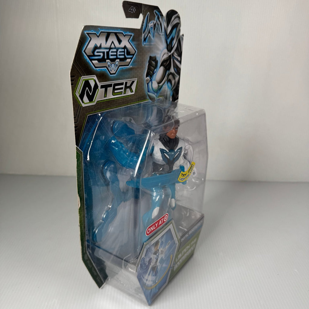 This Mattel Max Steel N-TEK Sonic Boomerang action figure stands approximately 4 inches tall and features a dynamic design inspired by the Max Steel franchise. Made of durable plastic, this figure includes articulated joints allowing for varied poses and play. The figure comes with two blue translucent boomerangs and a detachable turbo sword, enhancing imaginative battle scenarios.