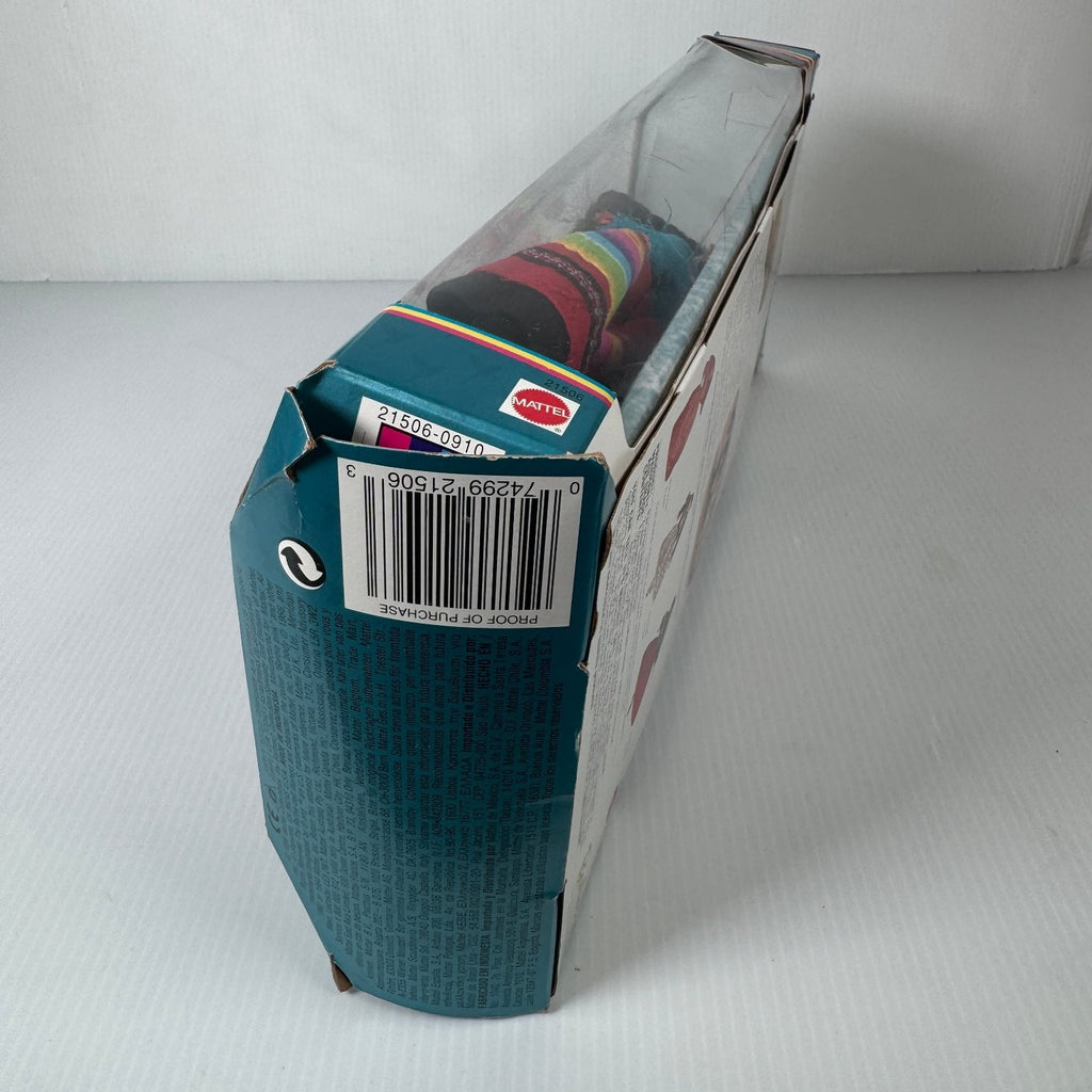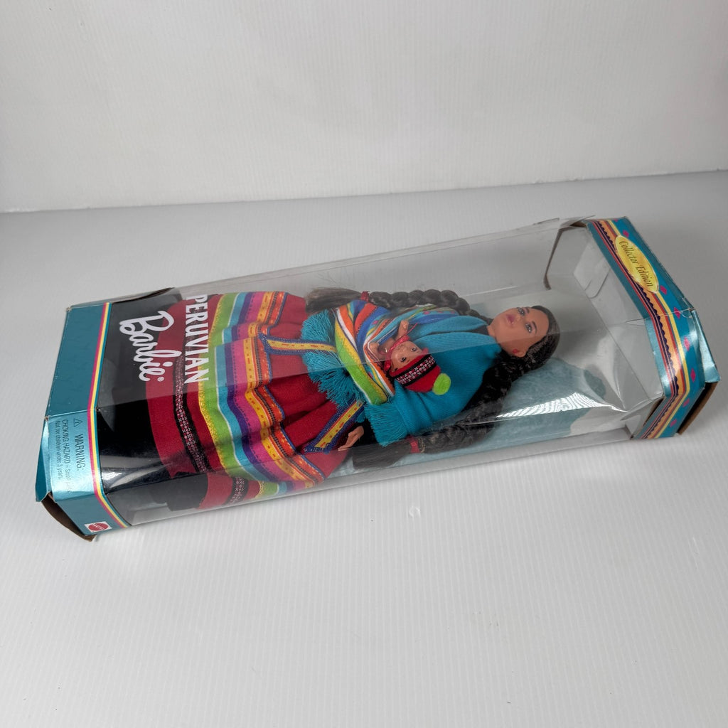 Crafted from high-quality plastic and fabric materials, this collectible doll offers limited articulation typical of Barbie dolls from its era. The set includes a dress, shawl, satchel, earrings, hairbrush, shoes, doll stand, and the baby doll, all housed in its original packaging. The box features colorful graphics and detailed descriptions about Peruvian culture and other dolls in the series, making it a great addition for collectors interested in world cultures or Barbie memorabilia.