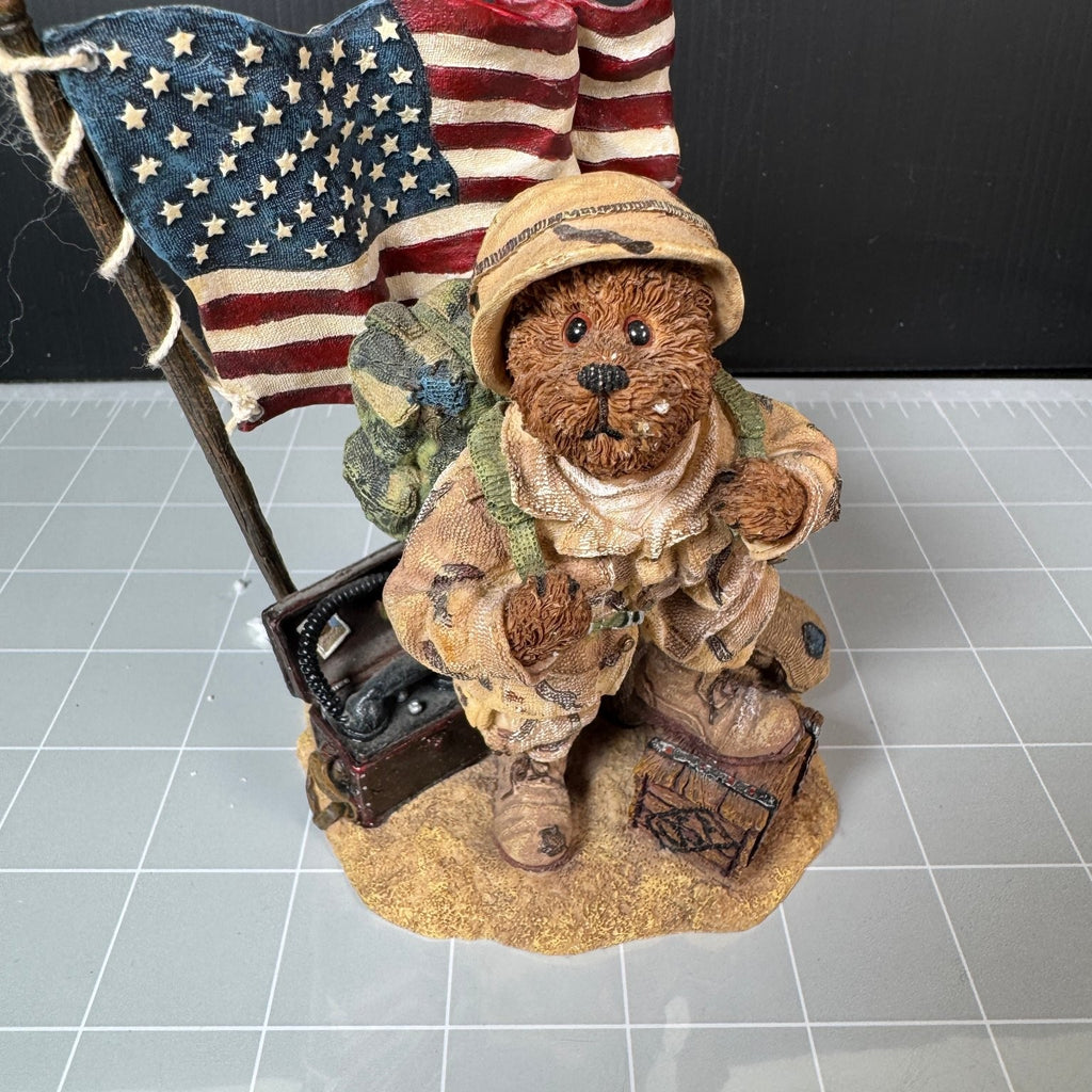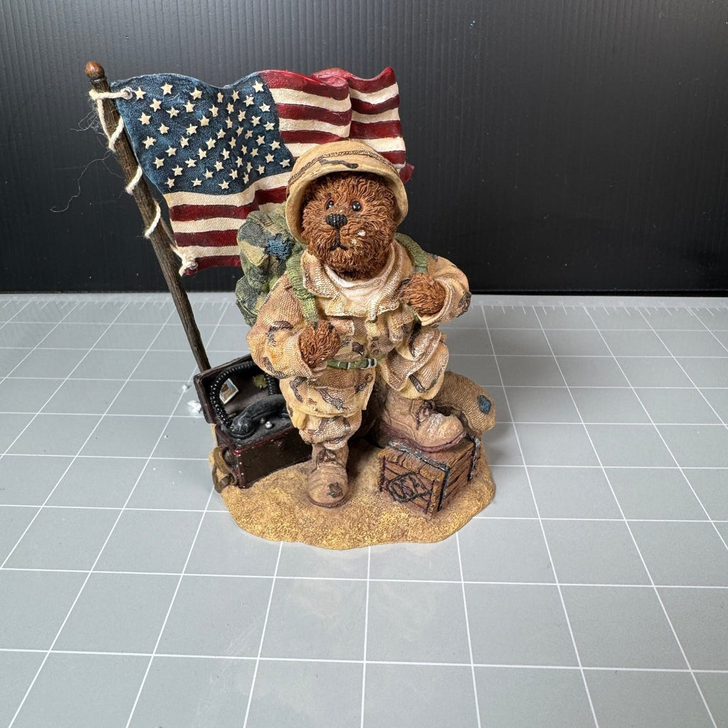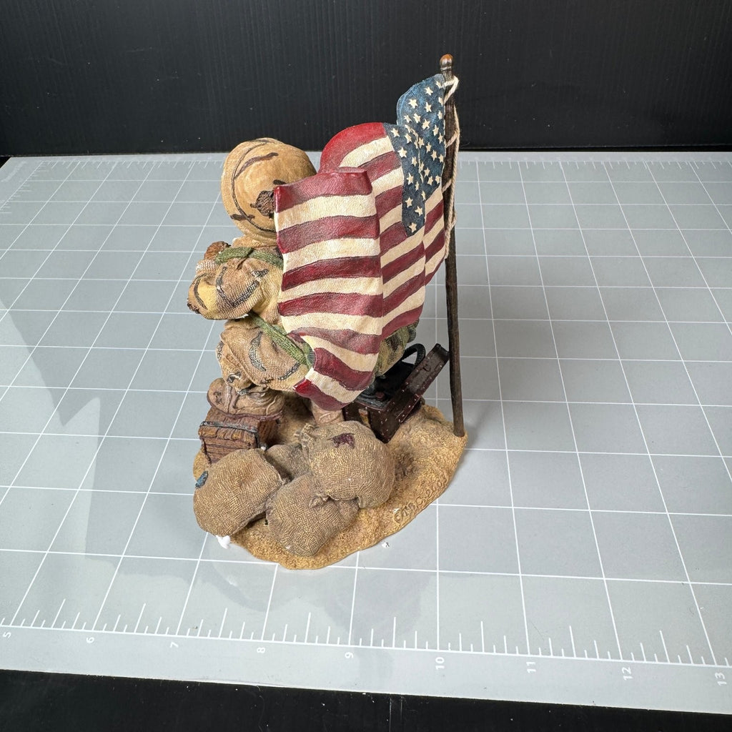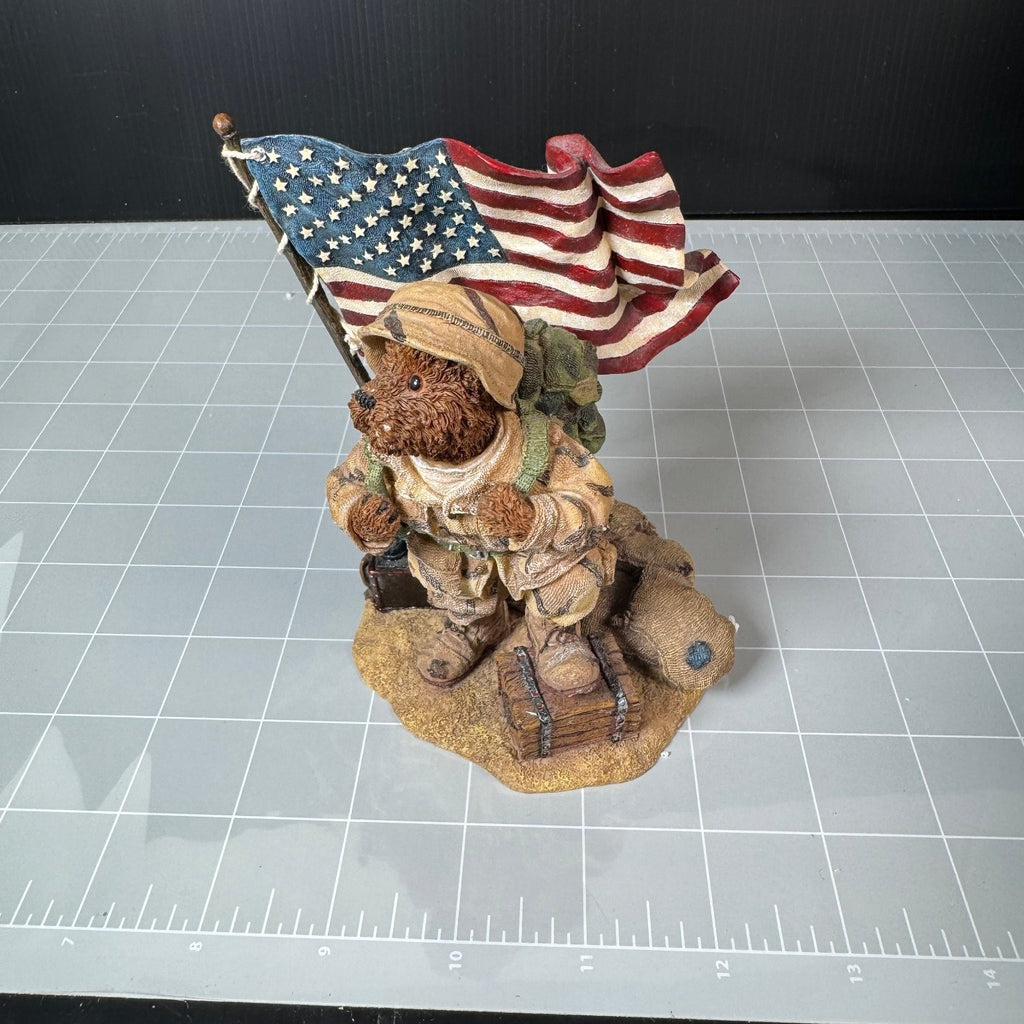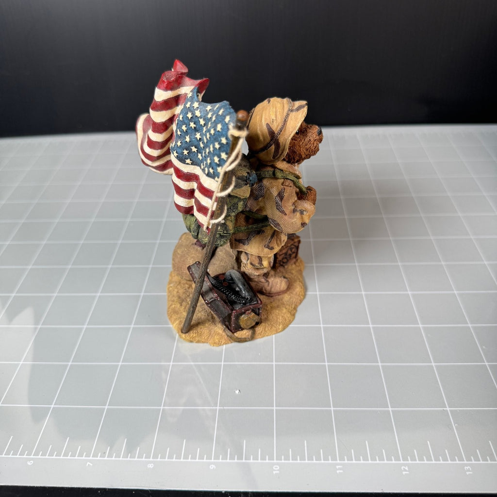 This McBruin collectible statue is part of the Boyds Bears & Friends Bearstone Collection, established in 1979. The figure depicts a detailed soldier bear wearing camouflage gear, a helmet, and carrying a backpack, standing next to an American flag and military gear on a textured base. This statue captures a patriotic theme with intricate sculpting and hand-painted colors.