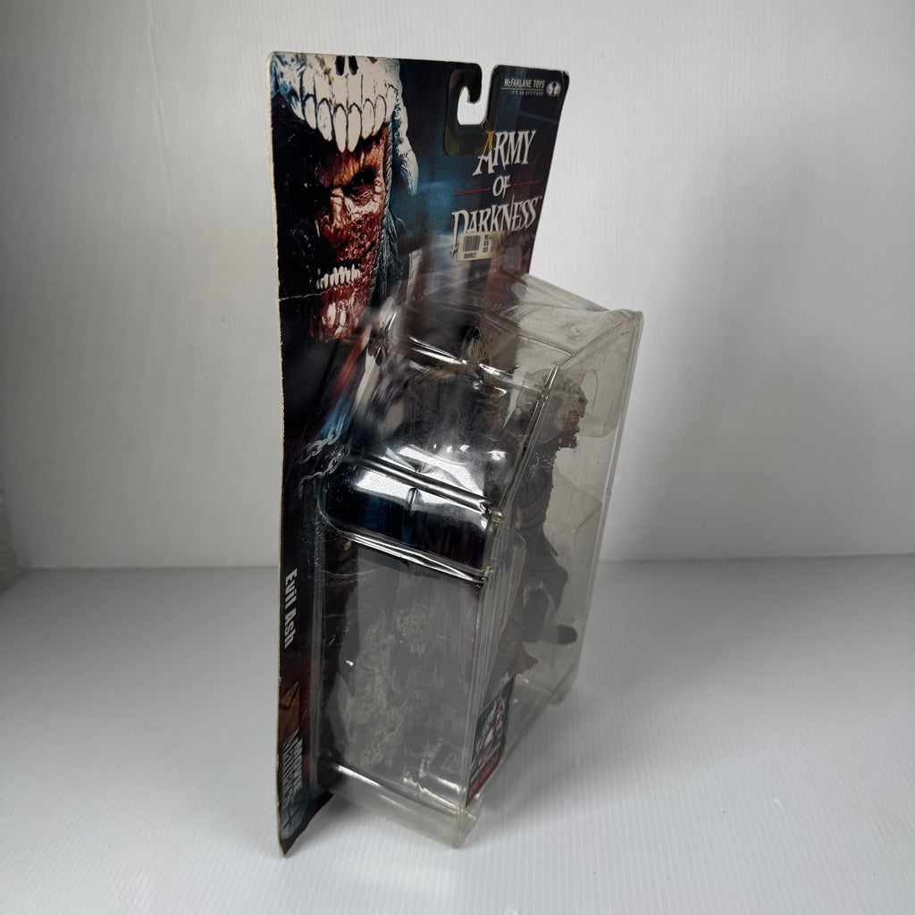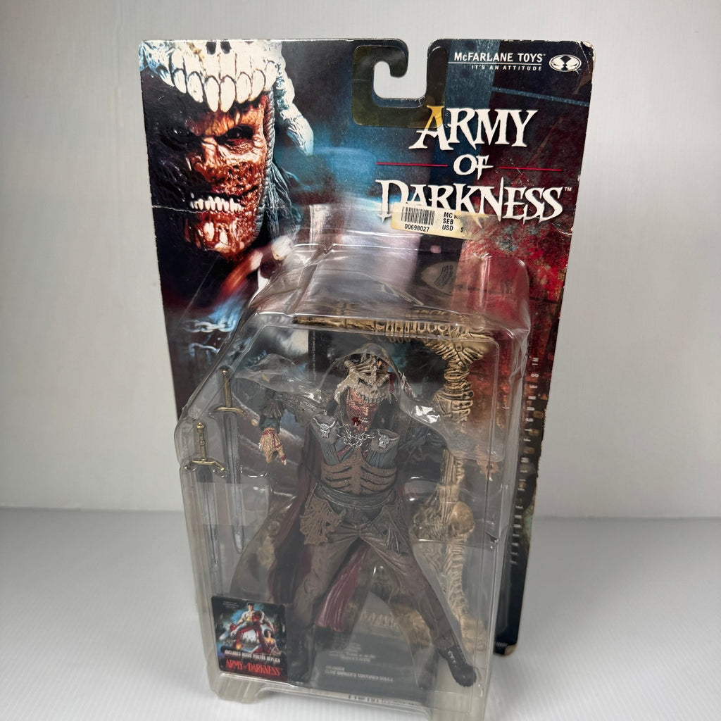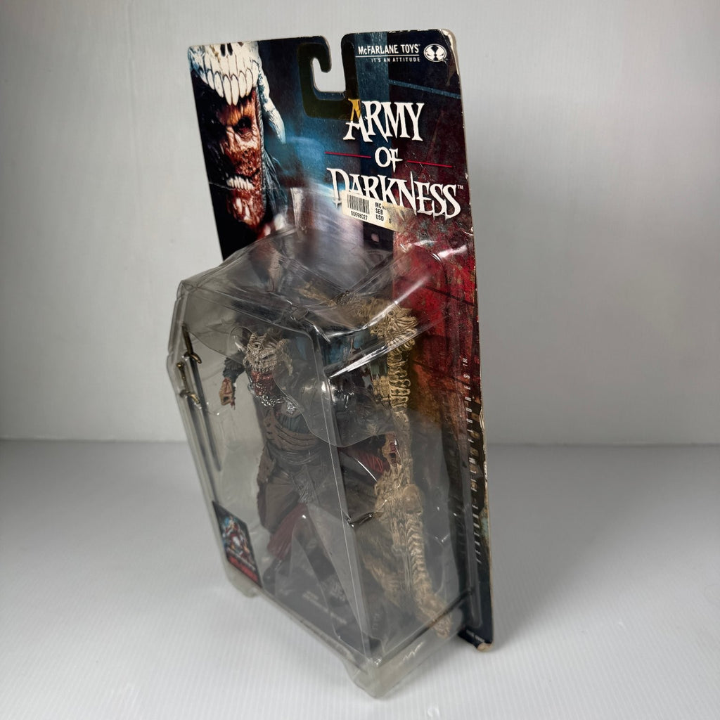 Included are two detailed swords and a movie poster replica, enhancing its appeal for collectors and fans alike. The figure is presented in its original blister packaging with vibrant Army of Darkness graphics, complete with the McFarlane Toys logo and series branding. This vintage collectible from the early 2000s is a must-have for horror enthusiasts and McFarlane collectors, showcasing the dark fantasy horror aesthetic with exceptional craftsmanship.This product is in New condition.